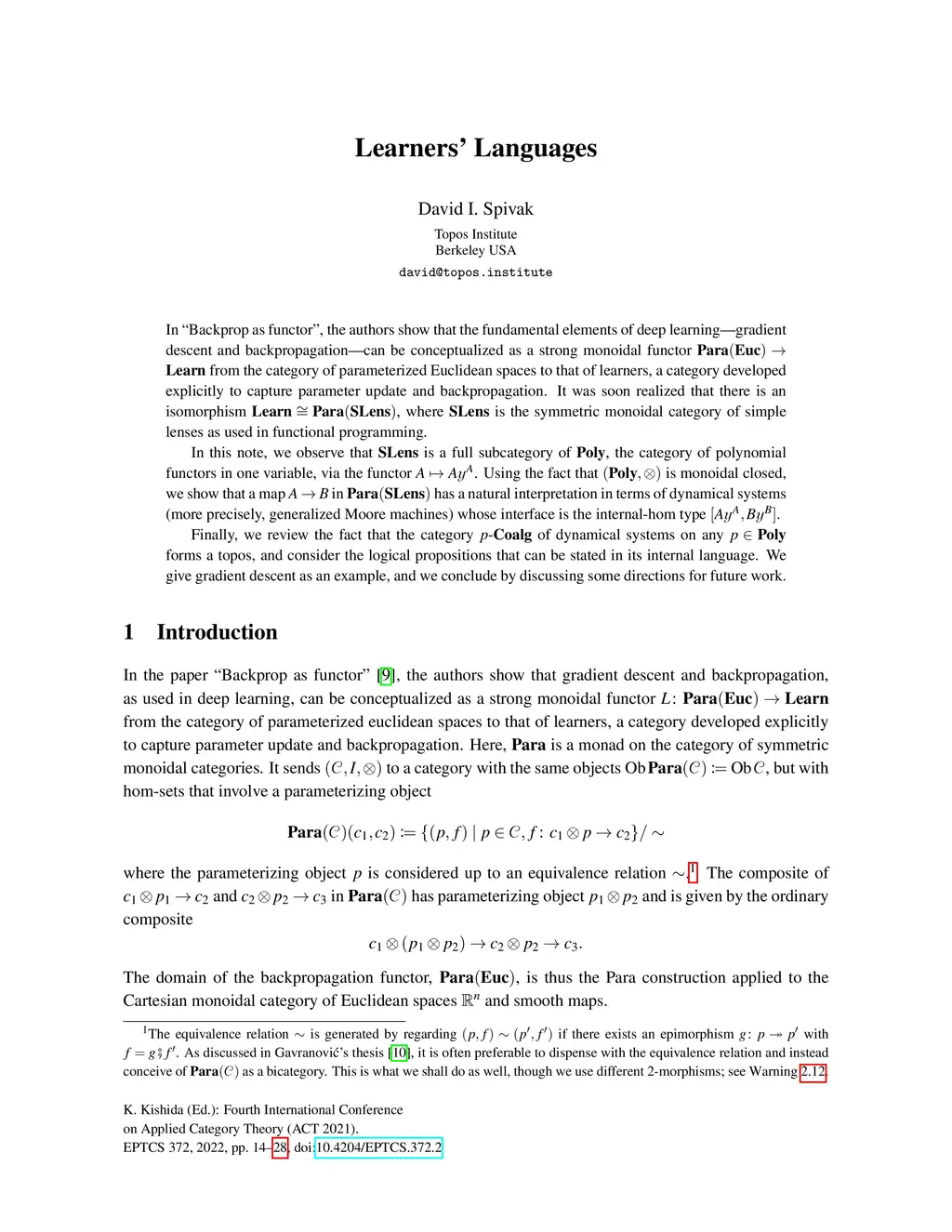 In "Backprop as functor", the authors show that the fundamental elements of deep learning -- gradient descent and backpropagation -- can be conceptualized as a strong monoidal functor Para(Euc)Learn from the category of parameterized Euclidean spaces to that of learners, a category developed explicitly to capture parameter update and backpropagation. It was soon realized that there is an isomorphism LearnPara(Slens), where Slens is the symmetric monoidal category of simple lenses as used in functional programming.In this note, we observe that Slens is a full subcategory of Poly, the category of polynomial functors in one variable, via the functor . Using the fact that (Poly,) is monoidal closed, we show that a map in Para(Slens) has a natural interpretation in terms of dynamical systems (more precisely, generalized Moore machines) whose interface is the internal-hom type .Finally, we review the fact that the category p-Coalg of dynamical systems on any Poly forms a topos, and consider the logical propositions that can be stated in its internal language. We give gradient descent as an example, and we conclude by discussing some directions for future work.