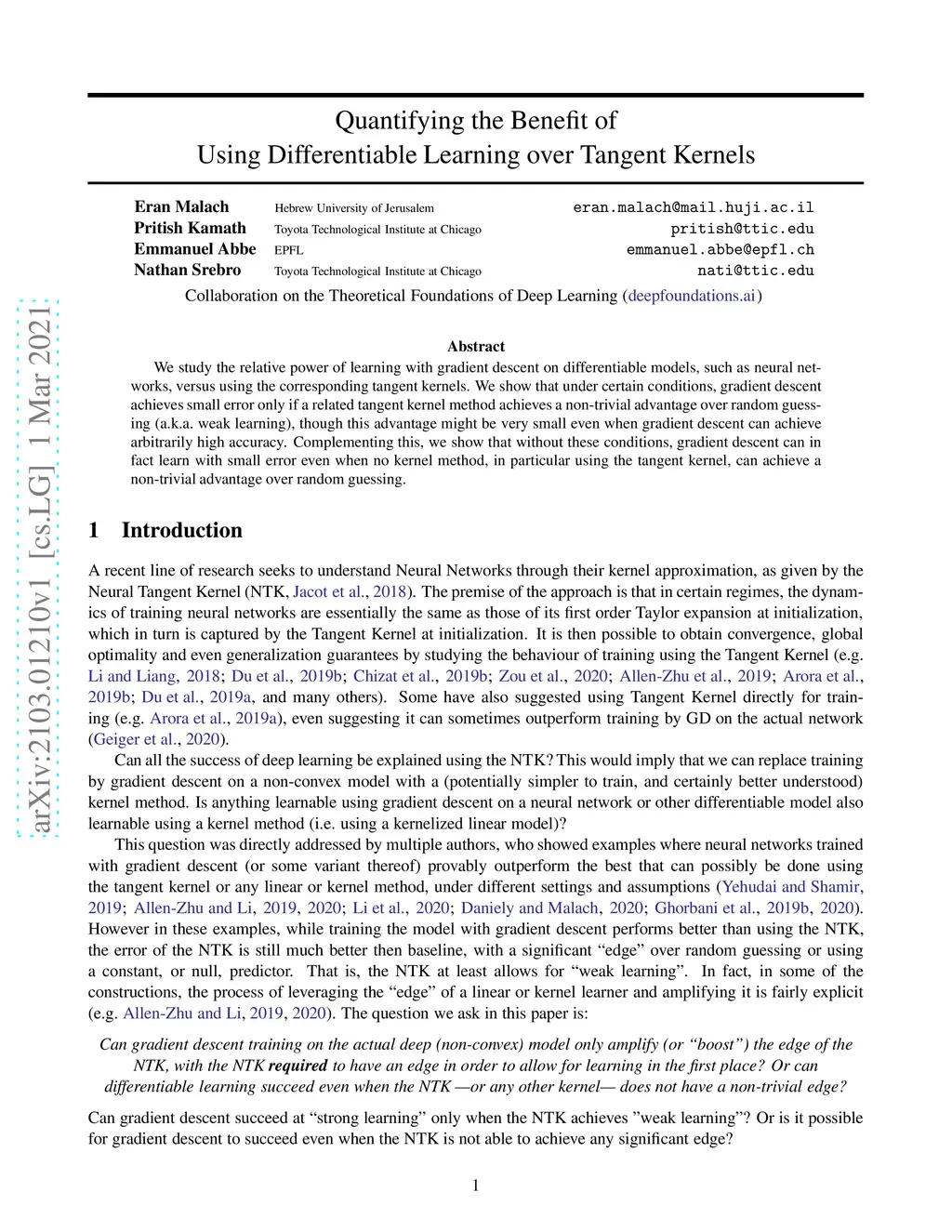 We study the relative power of learning with gradient descent on differentiable models, such as neural networks, versus using the corresponding tangent kernels. We show that under certain conditions, gradient descent achieves small error only if a related tangent kernel method achieves a non-trivial advantage over random guessing (a.k.a. weak learning), though this advantage might be very small even when gradient descent can achieve arbitrarily high accuracy. Complementing this, we show that without these conditions, gradient descent can in fact learn with small error even when no kernel method, in particular using the tangent kernel, can achieve a non-trivial advantage over random guessing.