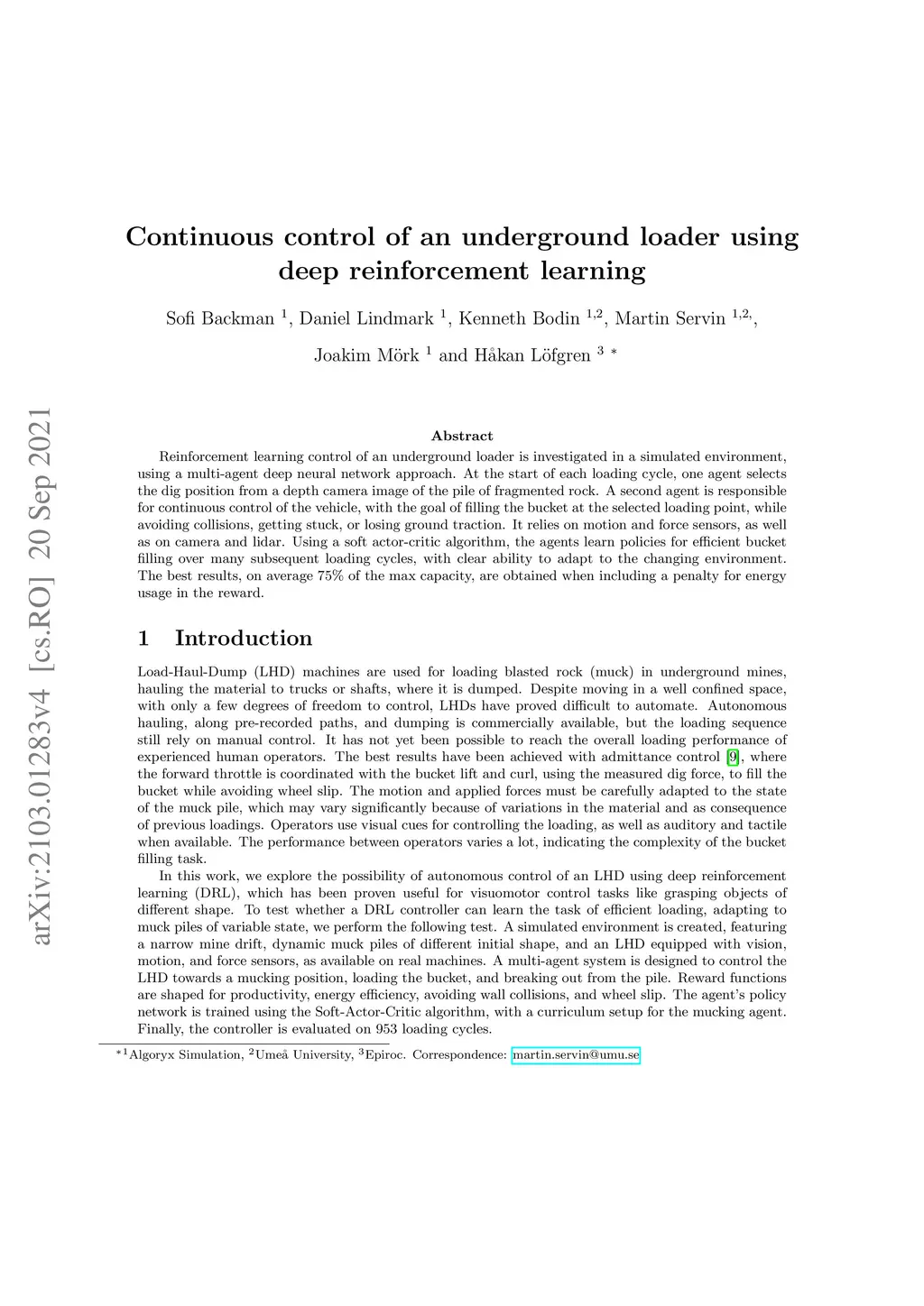 Reinforcement learning control of an underground loader is investigated in simulated environment, using a multi-agent deep neural network approach. At the start of each loading cycle, one agent selects the dig position from a depth camera image of the pile of fragmented rock. A second agent is responsible for continuous control of the vehicle, with the goal of filling the bucket at the selected loading point, while avoiding collisions, getting stuck, or losing ground traction. It relies on motion and force sensors, as well as on camera and lidar. Using a soft actor-critic algorithm the agents learn policies for efficient bucket filling over many subsequent loading cycles, with clear ability to adapt to the changing environment. The best results, on average 75% of the max capacity, are obtained when including a penalty for energy usage in the reward.