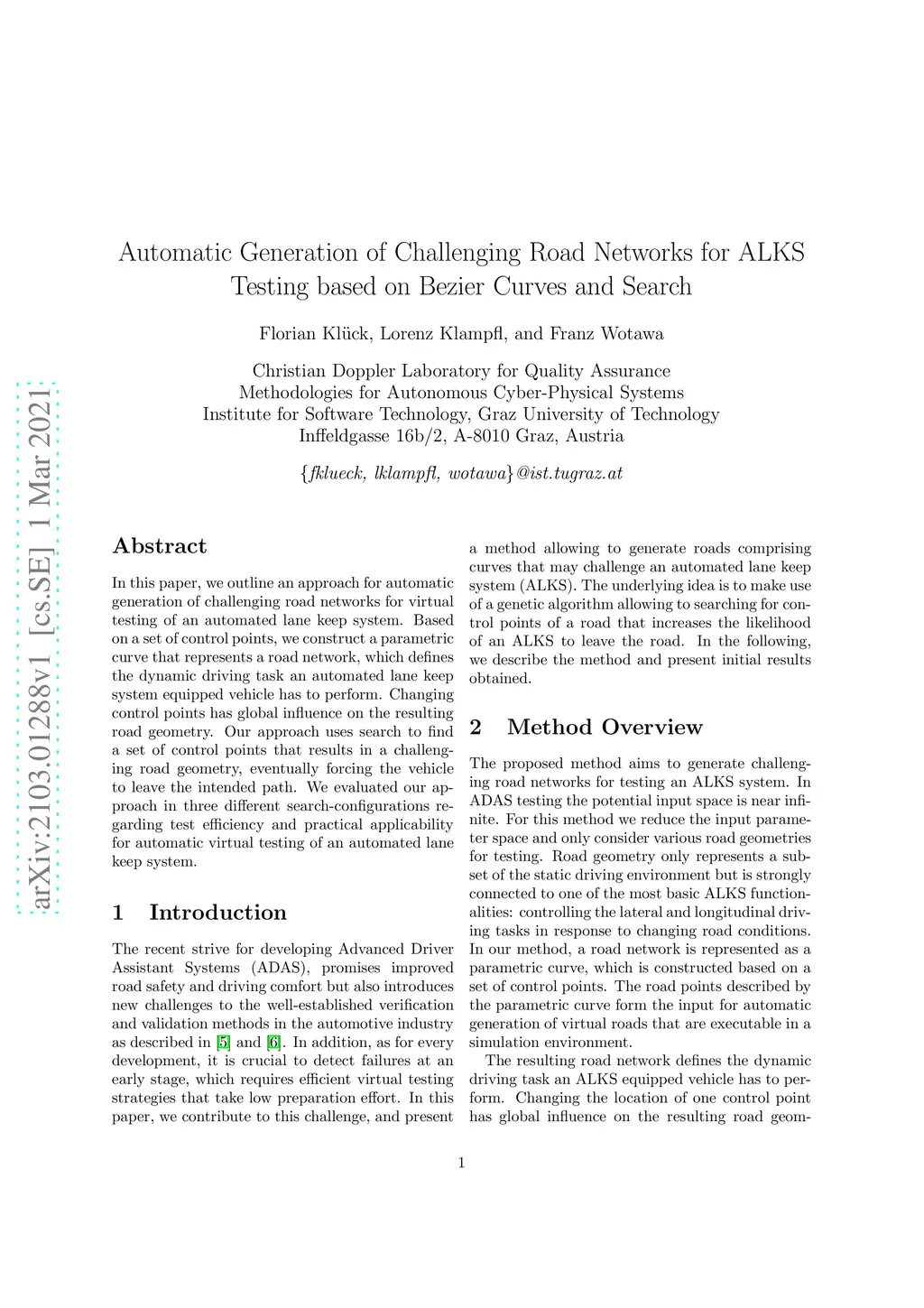 In this paper, we outline an approach for automatic generation of challenging road networks for virtual testing of an automated lane keep system. Based on a set of control points, we construct a parametric curve that represents a road network, which defines the dynamic driving task an automated lane keep system equipped vehicle has to perform. Changing control points has global influence on the resulting road geometry. Our approach uses search to find a set of control points that results in a challenging road geometry, eventually forcing the vehicle to leave the intended path. We evaluated our approach in three different search-configurations regarding test efficiency and practical applicability for automatic virtual testing of an automated lane keep system.