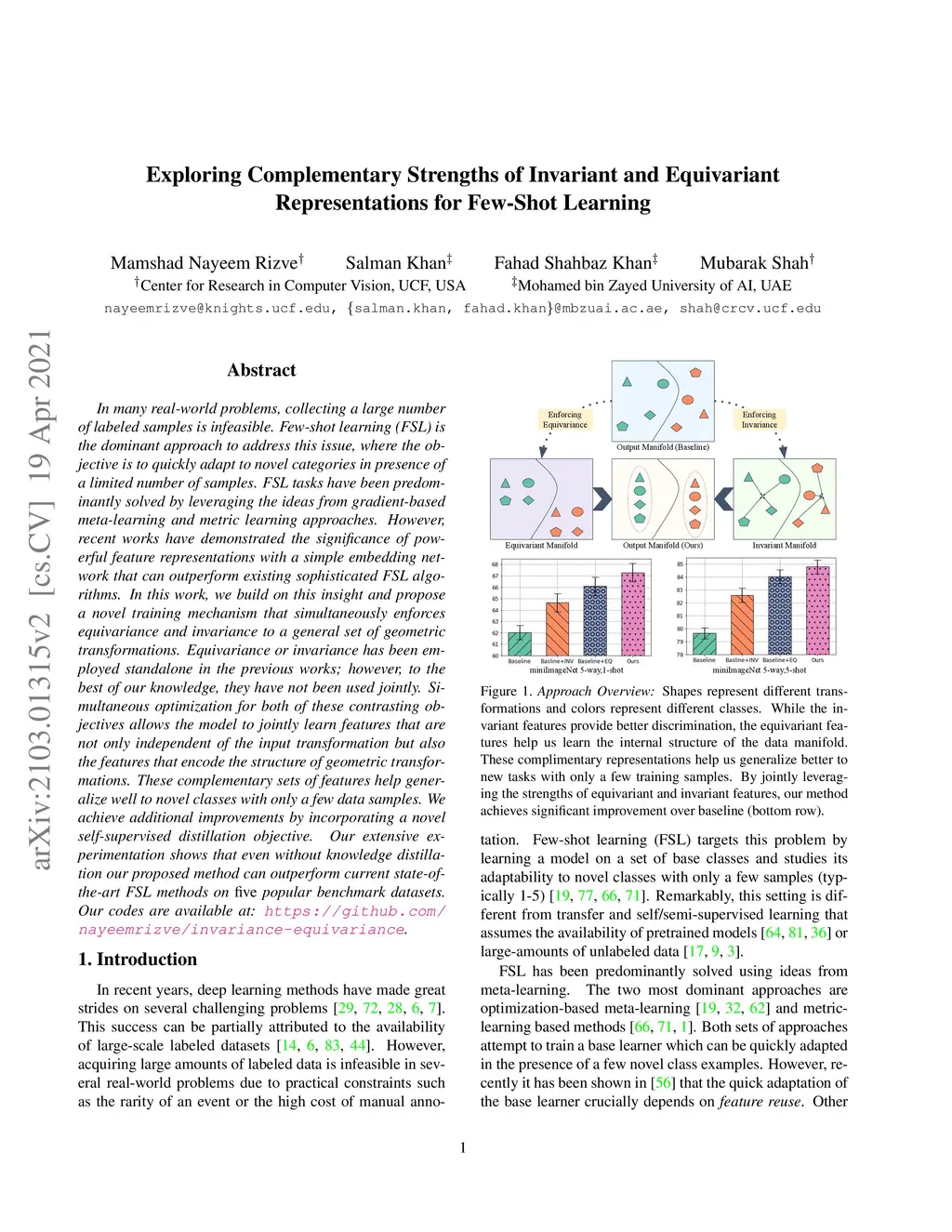 In many real-world problems, collecting a large number of labeled samples is infeasible. Few-shot learning (FSL) is the dominant approach to address this issue, where the objective is to quickly adapt to novel categories in presence of a limited number of samples. FSL tasks have been predominantly solved by leveraging the ideas from gradient-based meta-learning and metric learning approaches. However, recent works have demonstrated the significance of powerful feature representations with a simple embedding network that can outperform existing sophisticated FSL algorithms. In this work, we build on this insight and propose a novel training mechanism that simultaneously enforces equivariance and invariance to a general set of geometric transformations. Equivariance or invariance has been employed standalone in the previous works; however, to the best of our knowledge, they have not been used jointly. Simultaneous optimization for both of these contrasting objectives allows the model to jointly learn features that are not only independent of the input transformation but also the features that encode the structure of geometric transformations. These complementary sets of features help generalize well to novel classes with only a few data samples. We achieve additional improvements by incorporating a novel self-supervised distillation objective. Our extensive experimentation shows that even without knowledge distillation our proposed method can outperform current state-of-the-art FSL methods on five popular benchmark datasets.