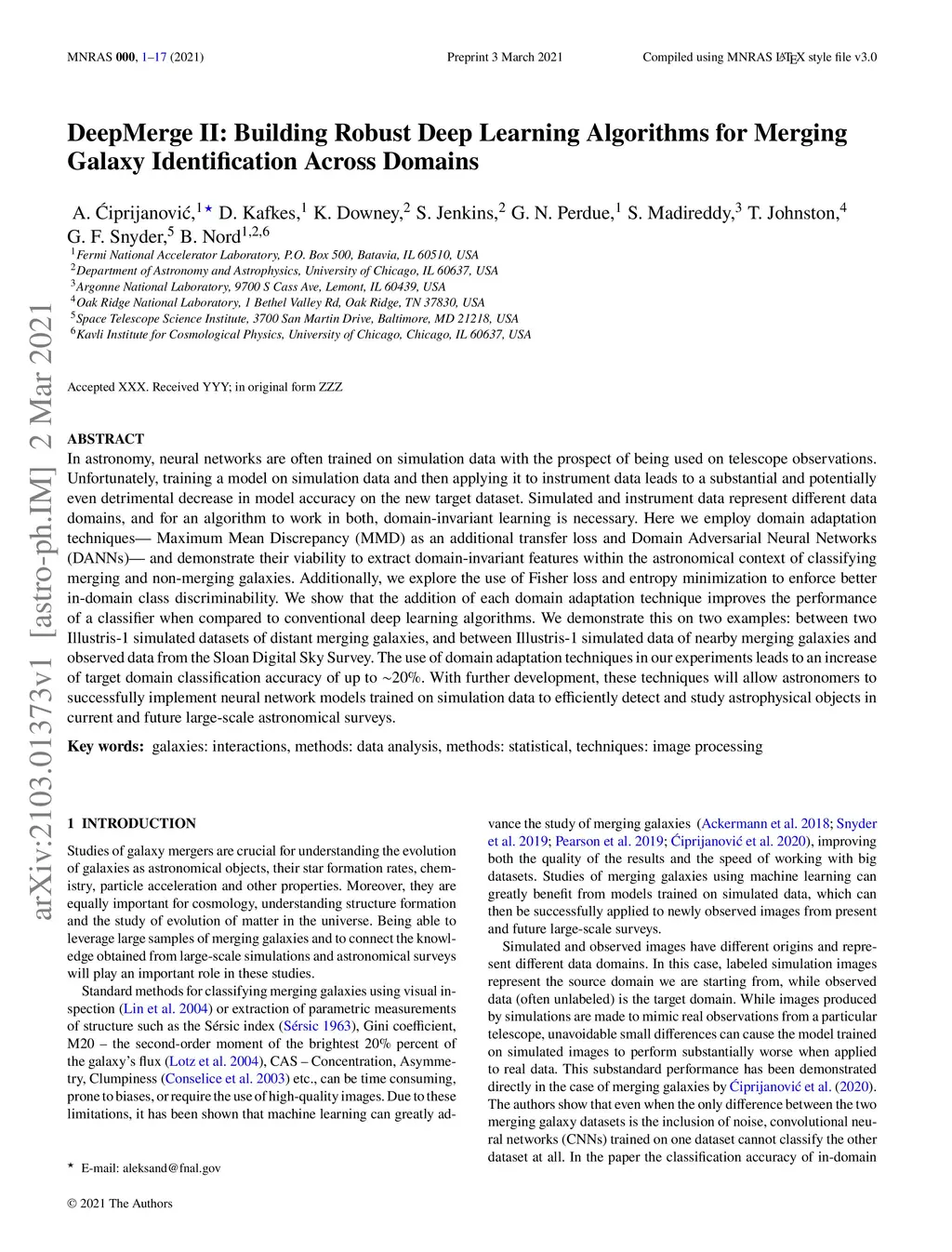In astronomy, neural networks are often trained on simulation data with the prospect of being used on telescope observations. Unfortunately, training a model on simulation data and then applying it to instrument data leads to a substantial and potentially even detrimental decrease in model accuracy on the new target dataset. Simulated and instrument data represent different data domains, and for an algorithm to work in both, domain-invariant learning is necessary. Here we employ domain adaptation techniques Maximum Mean Discrepancy (MMD) as an additional transfer loss and Domain Adversarial Neural Networks (DANNs) and demonstrate their viability to extract domain-invariant features within the astronomical context of classifying merging and non-merging galaxies. Additionally, we explore the use of Fisher loss and entropy minimization to enforce better in-domain class discriminability. We show that the addition of each domain adaptation technique improves the performance of a classifier when compared to conventional deep learning algorithms. We demonstrate this on two examples: between two Illustris-1 simulated datasets of distant merging galaxies, and between Illustris-1 simulated data of nearby merging galaxies and observed data from the Sloan Digital Sky Survey. The use of domain adaptation techniques in our experiments leads to an increase of target domain classification accuracy of up to . With further development, these techniques will allow astronomers to successfully implement neural network models trained on simulation data to efficiently detect and study astrophysical objects in current and future large-scale astronomical surveys.