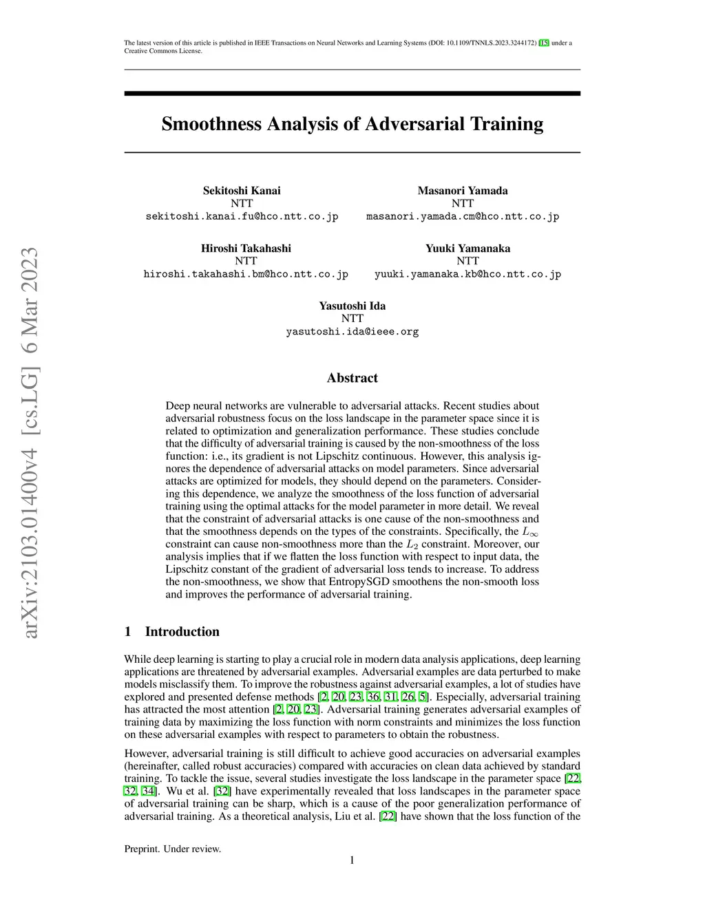 Deep neural networks are vulnerable to adversarial attacks. Recent studies about adversarial robustness focus on the loss landscape in the parameter space since it is related to optimization and generalization performance. These studies conclude that the difficulty of adversarial training is caused by the non-smoothness of the loss function: i.e., its gradient is not Lipschitz continuous. However, this analysis ignores the dependence of adversarial attacks on model parameters. Since adversarial attacks are optimized for models, they should depend on the parameters. Considering this dependence, we analyze the smoothness of the loss function of adversarial training using the optimal attacks for the model parameter in more detail. We reveal that the constraint of adversarial attacks is one cause of the non-smoothness and that the smoothness depends on the types of the constraints. Specifically, the constraint can cause non-smoothness more than the constraint. Moreover, our analysis implies that if we flatten the loss function with respect to input data, the Lipschitz constant of the gradient of adversarial loss tends to increase. To address the non-smoothness, we show that EntropySGD smoothens the non-smooth loss and improves the performance of adversarial training.
