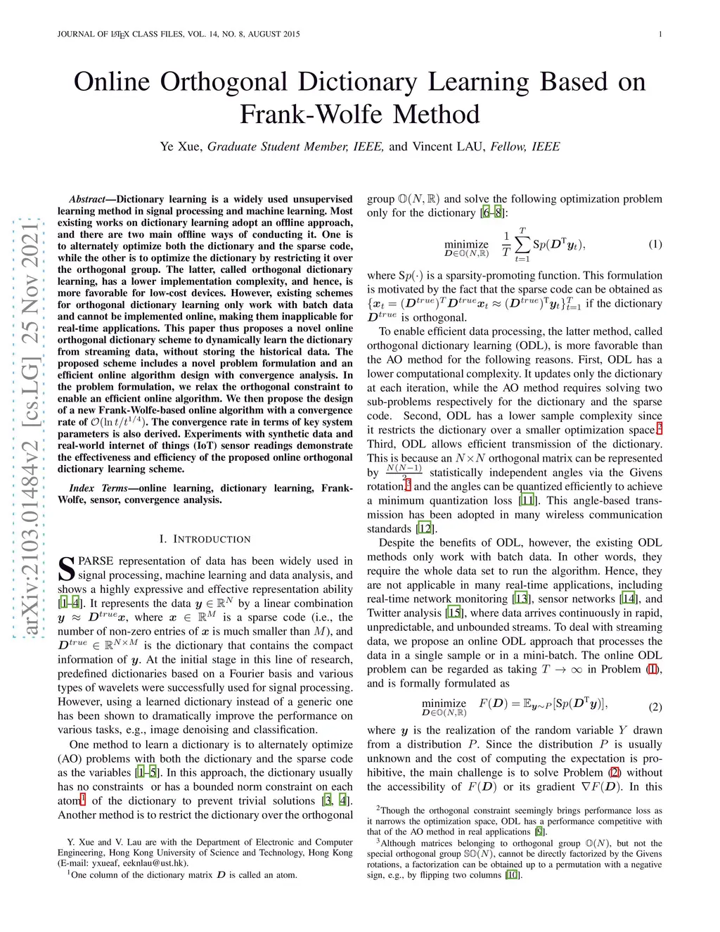 Online Orthogonal Dictionary Learning Based on Frank-Wolfe Method