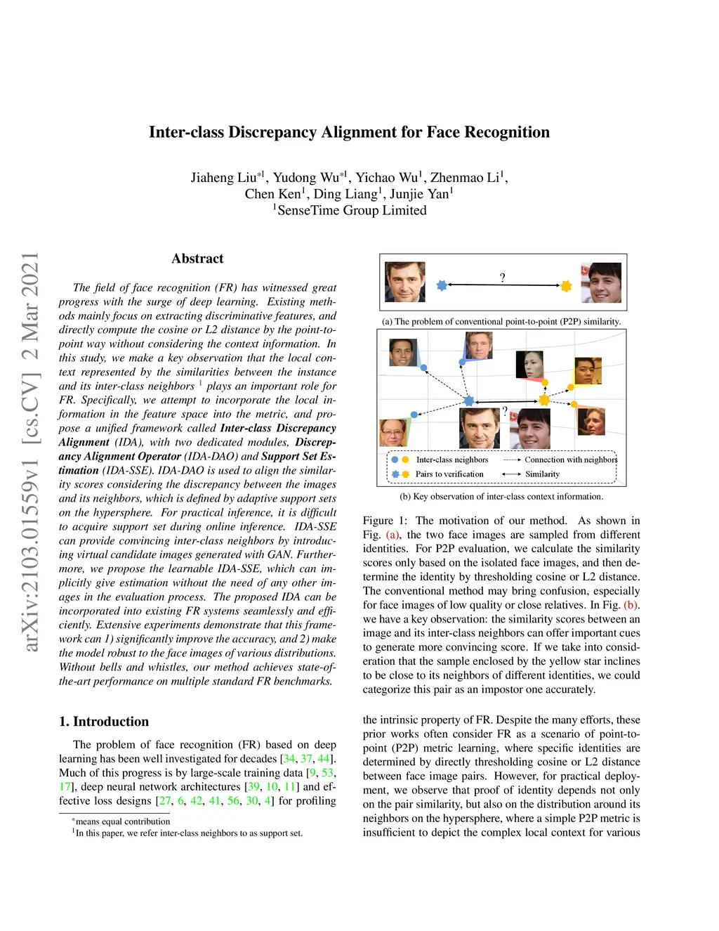 The field of face recognition (FR) has witnessed great progress with the surge of deep learning. Existing methods mainly focus on extracting discriminative features, and directly compute the cosine or L2 distance by the point-to-point way without considering the context information. In this study, we make a key observation that the local con-text represented by the similarities between the instance and its inter-class neighbors1plays an important role forFR. Specifically, we attempt to incorporate the local in-formation in the feature space into the metric, and pro-pose a unified framework calledInter-class DiscrepancyAlignment(IDA), with two dedicated modules, Discrepancy Alignment Operator(IDA-DAO) andSupport Set Estimation(IDA-SSE). IDA-DAO is used to align the similarity scores considering the discrepancy between the images and its neighbors, which is defined by adaptive support sets on the hypersphere. For practical inference, it is difficult to acquire support set during online inference. IDA-SSE can provide convincing inter-class neighbors by introducing virtual candidate images generated with GAN. Further-more, we propose the learnable IDA-SSE, which can implicitly give estimation without the need of any other images in the evaluation process. The proposed IDA can be incorporated into existing FR systems seamlessly and efficiently. Extensive experiments demonstrate that this frame-work can 1) significantly improve the accuracy, and 2) make the model robust to the face images of various distributions.Without bells and whistles, our method achieves state-of-the-art performance on multiple standard FR benchmarks.