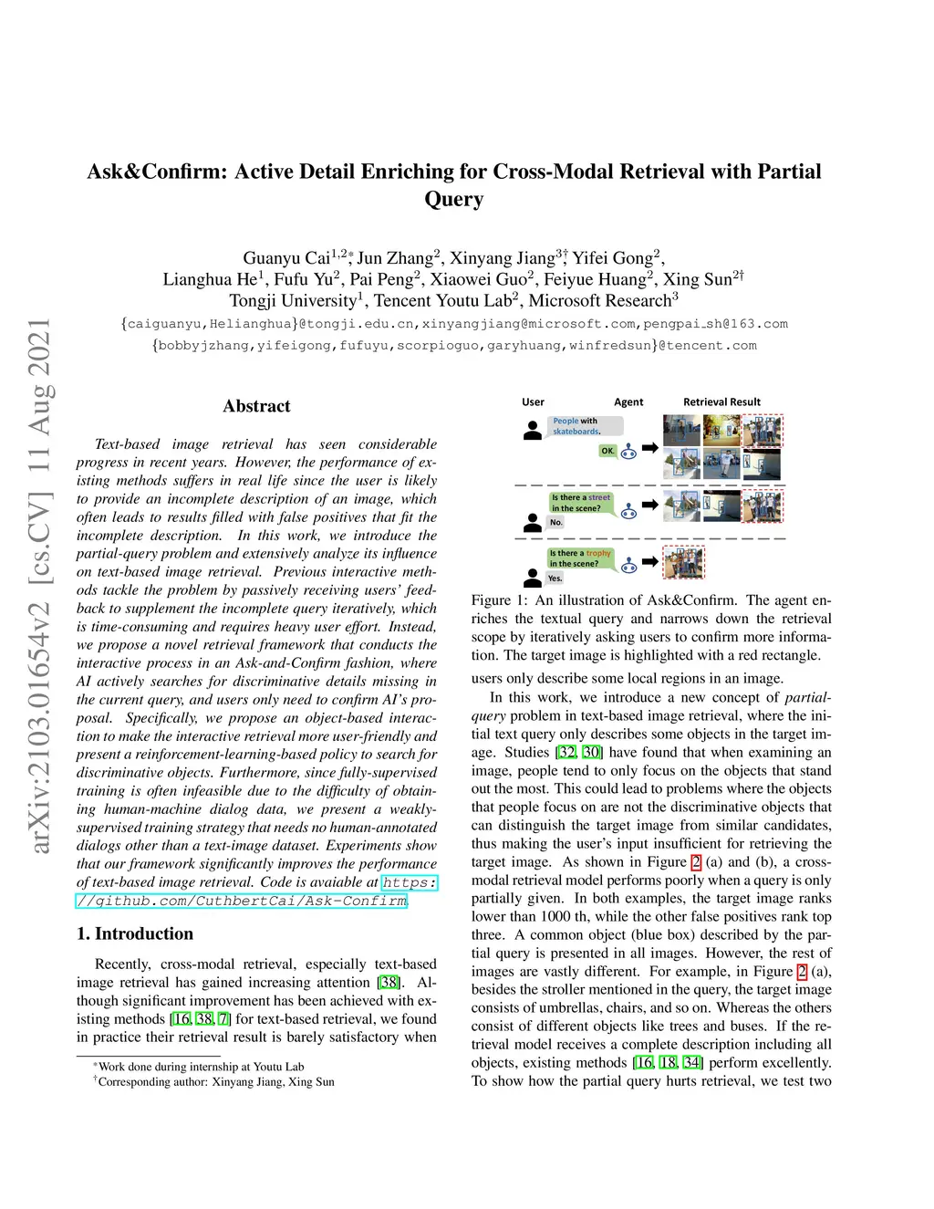 Text-based image retrieval has seen considerable progress in recent years. However, the performance of existing methods suffers in real life since the user is likely to provide an incomplete description of an image, which often leads to results filled with false positives that fit the incomplete description. In this work, we introduce the partial-query problem and extensively analyze its influence on text-based image retrieval. Previous interactive methods tackle the problem by passively receiving users' feedback to supplement the incomplete query iteratively, which is time-consuming and requires heavy user effort. Instead, we propose a novel retrieval framework that conducts the interactive process in an Ask-and-Confirm fashion, where AI actively searches for discriminative details missing in the current query, and users only need to confirm AI's proposal. Specifically, we propose an object-based interaction to make the interactive retrieval more user-friendly and present a reinforcement-learning-based policy to search for discriminative objects. Furthermore, since fully-supervised training is often infeasible due to the difficulty of obtaining human-machine dialog data, we present a weakly-supervised training strategy that needs no human-annotated dialogs other than a text-image dataset. Experiments show that our framework significantly improves the performance of text-based image retrieval. Code is avaiable at https://github.com/CuthbertCai/Ask-Confirm.