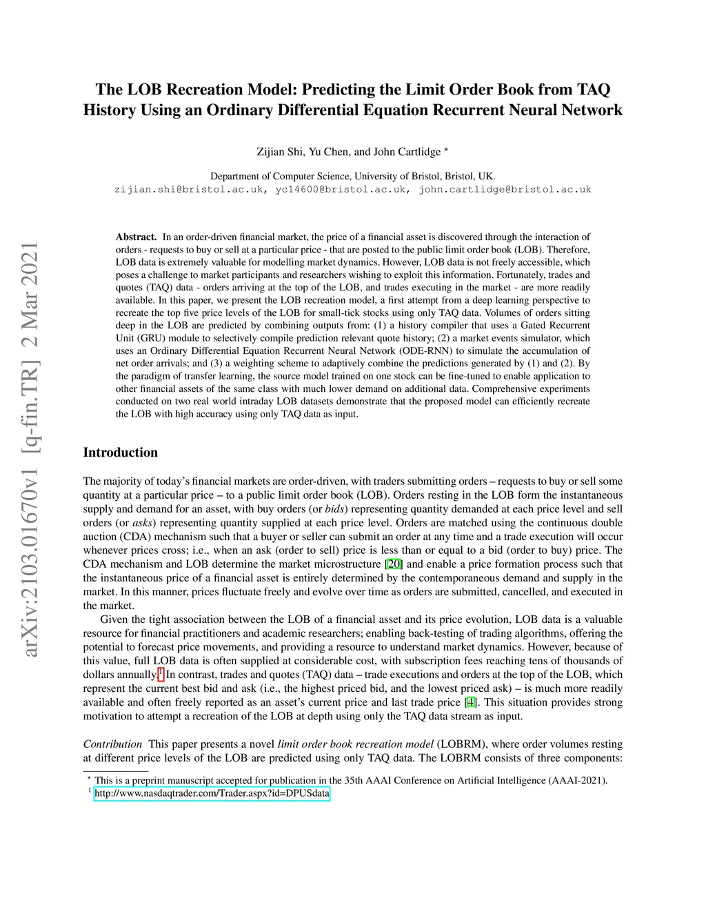In an order-driven financial market, the price of a financial asset is discovered through the interaction of orders - requests to buy or sell at a particular price - that are posted to the public limit order book (LOB). Therefore, LOB data is extremely valuable for modelling market dynamics. However, LOB data is not freely accessible, which poses a challenge to market participants and researchers wishing to exploit this information. Fortunately, trades and quotes (TAQ) data - orders arriving at the top of the LOB, and trades executing in the market - are more readily available. In this paper, we present the LOB recreation model, a first attempt from a deep learning perspective to recreate the top five price levels of the LOB for small-tick stocks using only TAQ data. Volumes of orders sitting deep in the LOB are predicted by combining outputs from: (1) a history compiler that uses a Gated Recurrent Unit (GRU) module to selectively compile prediction relevant quote history; (2) a market events simulator, which uses an Ordinary Differential Equation Recurrent Neural Network (ODE-RNN) to simulate the accumulation of net order arrivals; and (3) a weighting scheme to adaptively combine the predictions generated by (1) and (2). By the paradigm of transfer learning, the source model trained on one stock can be fine-tuned to enable application to other financial assets of the same class with much lower demand on additional data. Comprehensive experiments conducted on two real world intraday LOB datasets demonstrate that the proposed model can efficiently recreate the LOB with high accuracy using only TAQ data as input.