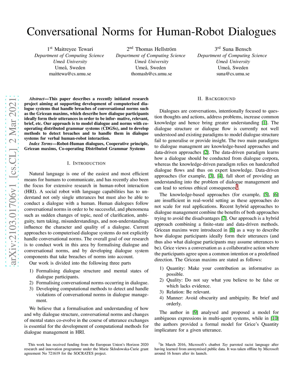 This paper describes a recently initiated research project aiming at supporting development of computerised dialogue systems that handle breaches of conversational norms such as the Gricean maxims, which describe how dialogue participants ideally form their utterances in order to be informative, relevant, brief, etc. Our approach is to model dialogue and norms with co-operating distributed grammar systems (CDGSs), and to develop methods to detect breaches and to handle them in dialogue systems for verbal human-robot interaction.