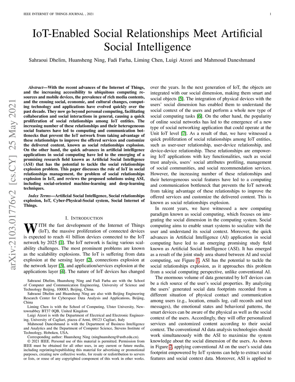 With the recent advances of the Internet of Things, and the increasing accessibility of ubiquitous computing resources and mobile devices, the prevalence of rich media contents, and the ensuing social, economic, and cultural changes, computing technology and applications have evolved quickly over the past decade. They now go beyond personal computing, facilitating collaboration and social interactions in general, causing a quick proliferation of social relationships among IoT entities. The increasing number of these relationships and their heterogeneous social features have led to computing and communication bottlenecks that prevent the IoT network from taking advantage of these relationships to improve the offered services and customize the delivered content, known as relationship explosion. On the other hand, the quick advances in artificial intelligence applications in social computing have led to the emerging of a promising research field known as Artificial Social Intelligence (ASI) that has the potential to tackle the social relationship explosion problem. This paper discusses the role of IoT in social relationships detection and management, the problem of social relationships explosion in IoT and reviews the proposed solutions using ASI, including social-oriented machine-learning and deep-learning techniques.