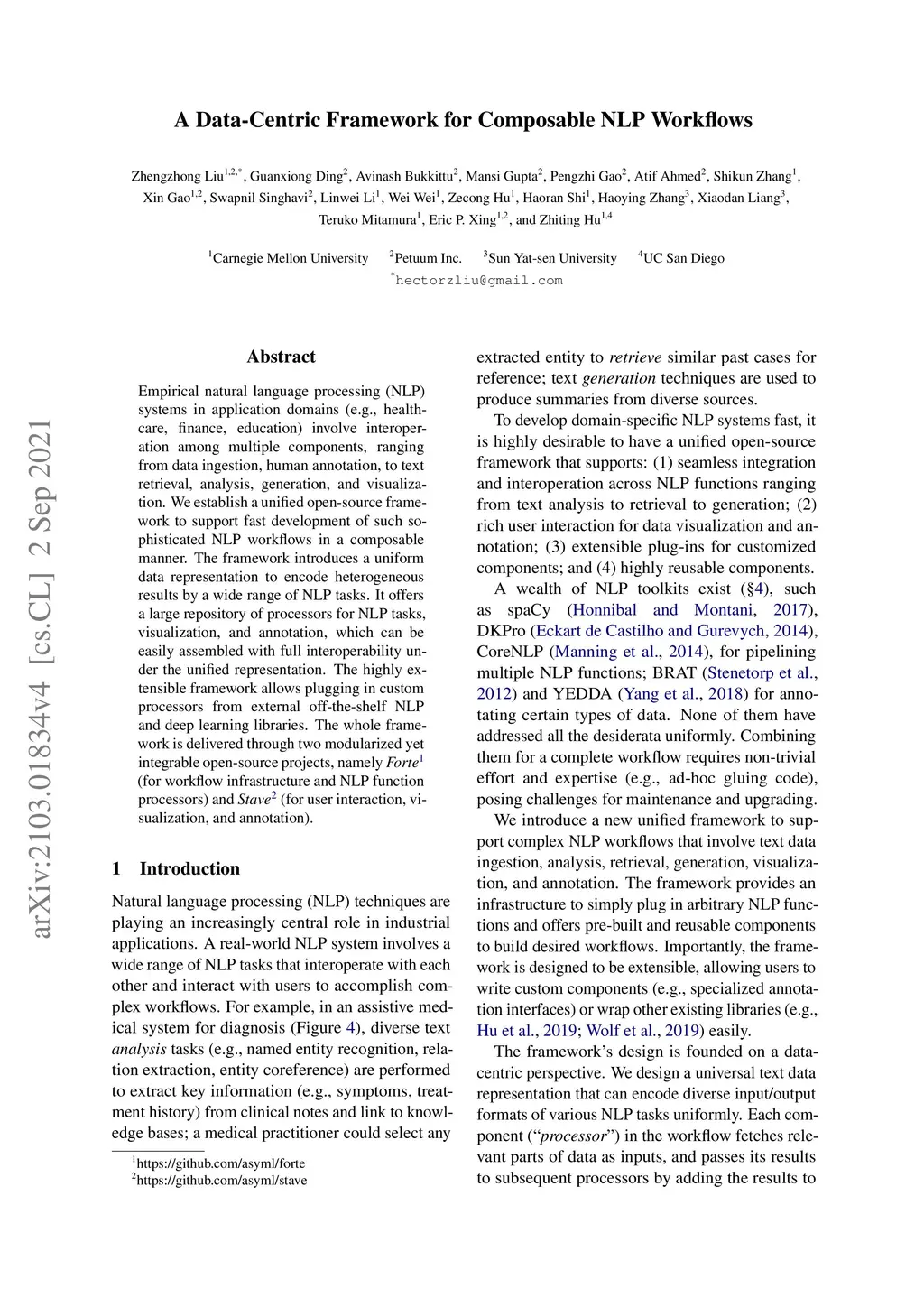 Empirical natural language processing (NLP) systems in application domains (e.g., healthcare, finance, education) involve interoperation among multiple components, ranging from data ingestion, human annotation, to text retrieval, analysis, generation, and visualization. We establish a unified open-source framework to support fast development of such sophisticated NLP workflows in a composable manner. The framework introduces a uniform data representation to encode heterogeneous results by a wide range of NLP tasks. It offers a large repository of processors for NLP tasks, visualization, and annotation, which can be easily assembled with full interoperability under the unified representation. The highly extensible framework allows plugging in custom processors from external off-the-shelf NLP and deep learning libraries. The whole framework is delivered through two modularized yet integratable open-source projects, namely Forte (for workflow infrastructure and NLP function processors) and Stave (for user interaction, visualization, and annotation).