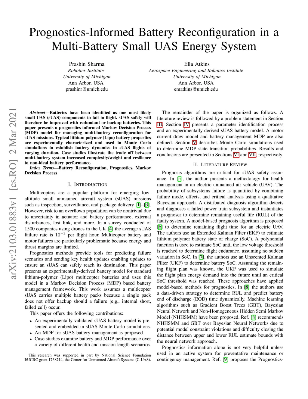 Batteries have been identified as one most likely small UAS (sUAS) components to fail in flight. sUAS safety will therefore be improved with redundant or backup batteries. This paper presents a prognostics-informed Markov Decision Process (MDP) model for managing multi-battery reconfiguration for sUAS missions. Typical lithium polymer (Lipo) battery properties are experimentally characterized and used in Monte Carlo simulations to establish battery dynamics in sUAS flights of varying duration. Case studies illustrate the trade off between multi-battery system increased complexity/weight and resilience to non-ideal battery performance.