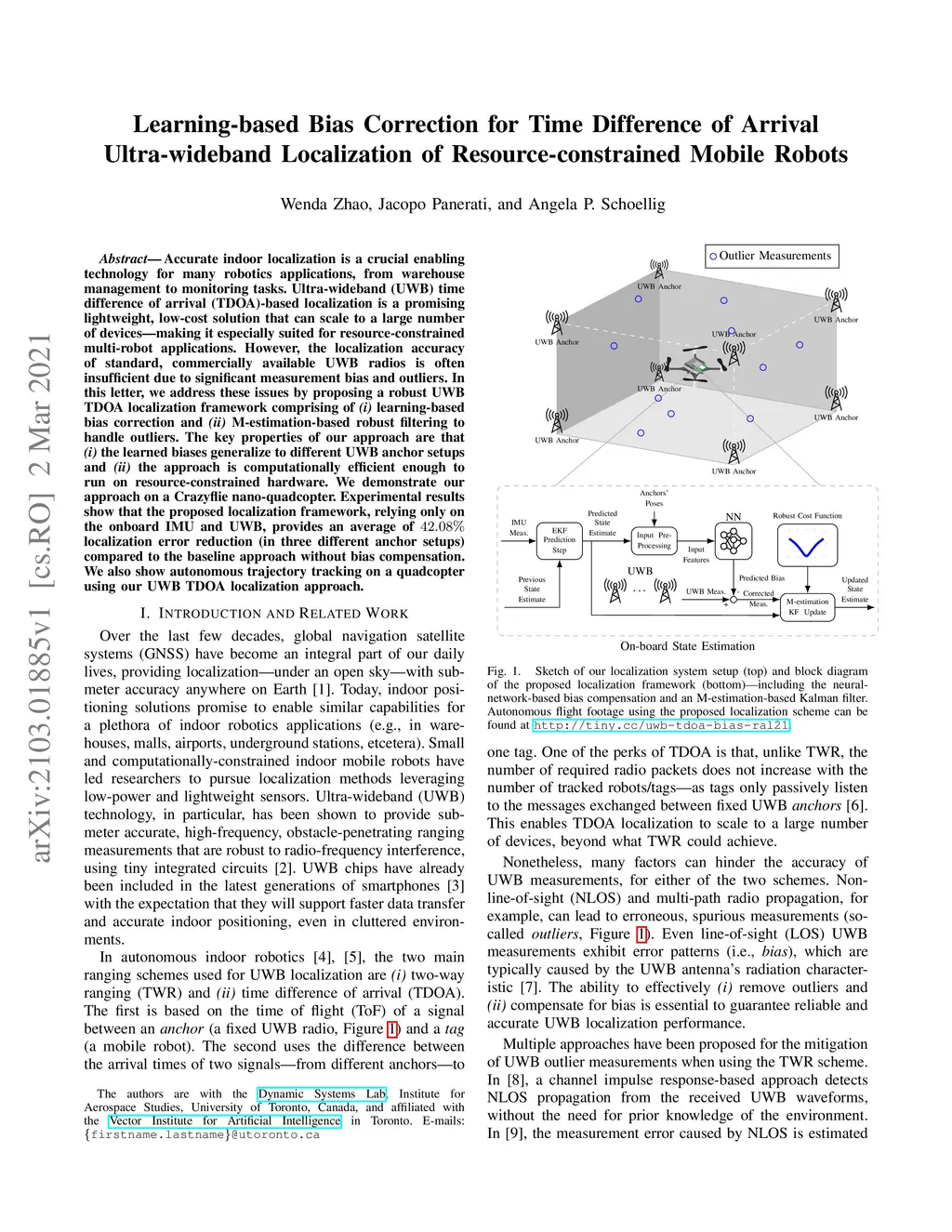 Accurate indoor localization is a crucial enabling technology for many robotics applications, from warehouse management to monitoring tasks. Ultra-wideband (UWB) time difference of arrival (TDOA)-based localization is a promising lightweight, low-cost solution that can scale to a large number of devices -- making it especially suited for resource-constrained multi-robot applications. However, the localization accuracy of standard, commercially available UWB radios is often insufficient due to significant measurement bias and outliers. In this letter, we address these issues by proposing a robust UWB TDOA localization framework comprising of (i) learning-based bias correction and (ii) M-estimation-based robust filtering to handle outliers. The key properties of our approach are that (i) the learned biases generalize to different UWB anchor setups and (ii) the approach is computationally efficient enough to run on resource-constrained hardware. We demonstrate our approach on a Crazyflie nano-quadcopter. Experimental results show that the proposed localization framework, relying only on the onboard IMU and UWB, provides an average of 42.08 percent localization error reduction (in three different anchor setups) compared to the baseline approach without bias compensation. {We also show autonomous trajectory tracking on a quadcopter using our UWB TDOA localization approach.}