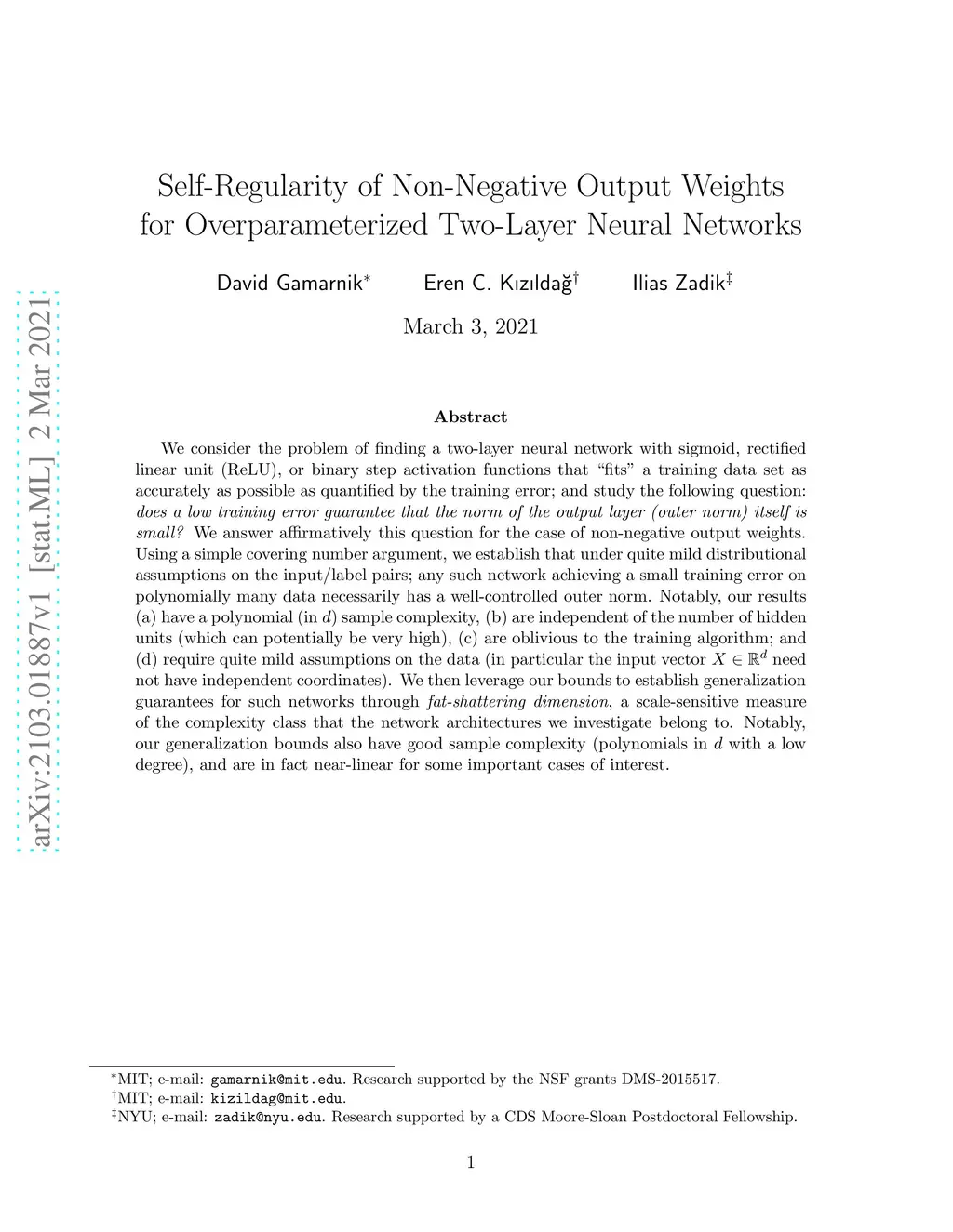 We consider the problem of finding a two-layer neural network with sigmoid, rectified linear unit (ReLU), or binary step activation functions that "fits" a training data set as accurately as possible as quantified by the training error; and study the following question: \emph{does a low training error guarantee that the norm of the output layer (outer norm) itself is small?} We answer affirmatively this question for the case of non-negative output weights. Using a simple covering number argument, we establish that under quite mild distributional assumptions on the input/label pairs; any such network achieving a small training error on polynomially many data necessarily has a well-controlled outer norm. Notably, our results (a) have a polynomial (in ) sample complexity, (b) are independent of the number of hidden units (which can potentially be very high), (c) are oblivious to the training algorithm; and (d) require quite mild assumptions on the data (in particular the input vector need not have independent coordinates). We then leverage our bounds to establish generalization guarantees for such networks through \emph{fat-shattering dimension}, a scale-sensitive measure of the complexity class that the network architectures we investigate belong to. Notably, our generalization bounds also have good sample complexity (polynomials in with a low degree), and are in fact near-linear for some important cases of interest.