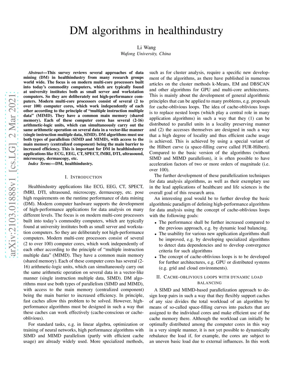 This survey reviews several approaches of data mining (DM) in healthindustry from many research groups world wide. The focus is on modern multi-core processors built into today's commodity computers, which are typically found at university institutes both as small server and workstation computers. So they are deliberately not high-performance computers. Modern multi-core processors consist of several (2 to over 100) computer cores, which work independently of each other according to the principle of "multiple instruction multiple data" (MIMD). They have a common main memory (shared memory). Each of these computer cores has several (2-16) arithmetic-logic units, which can simultaneously carry out the same arithmetic operation on several data in a vector-like manner (single instruction multiple data, SIMD). DM algorithms must use both types of parallelism (SIMD and MIMD), with access to the main memory (centralized component) being the main barrier to increased efficiency. This is important for DM in healthindustry applications like ECG, EEG, CT, SPECT, fMRI, DTI, ultrasound, microscopy, dermascopy, etc.