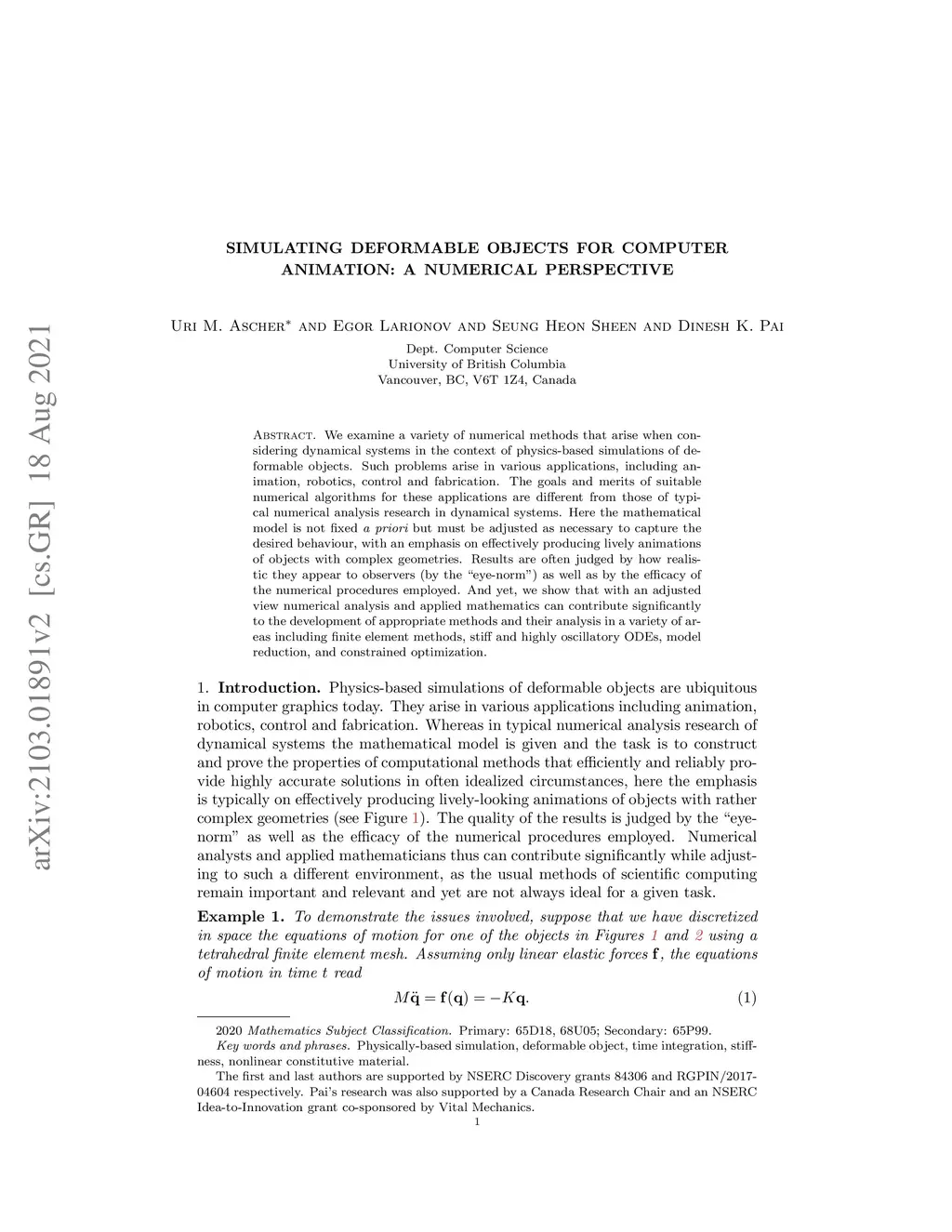 We examine a variety of numerical methods that arise when considering dynamical systems in the context of physics-based simulations of deformable objects. Such problems arise in various applications, including animation, robotics, control and fabrication. The goals and merits of suitable numerical algorithms for these applications are different from those of typical numerical analysis research in dynamical systems. Here the mathematical model is not fixed a priori but must be adjusted as necessary to capture the desired behaviour, with an emphasis on effectively producing lively animations of objects with complex geometries. Results are often judged by how realistic they appear to observers (by the "eye-norm") as well as by the efficacy of the numerical procedures employed. And yet, we show that with an adjusted view numerical analysis and applied mathematics can contribute significantly to the development of appropriate methods and their analysis in a variety of areas including finite element methods, stiff and highly oscillatory ODEs, model reduction, and constrained optimization.