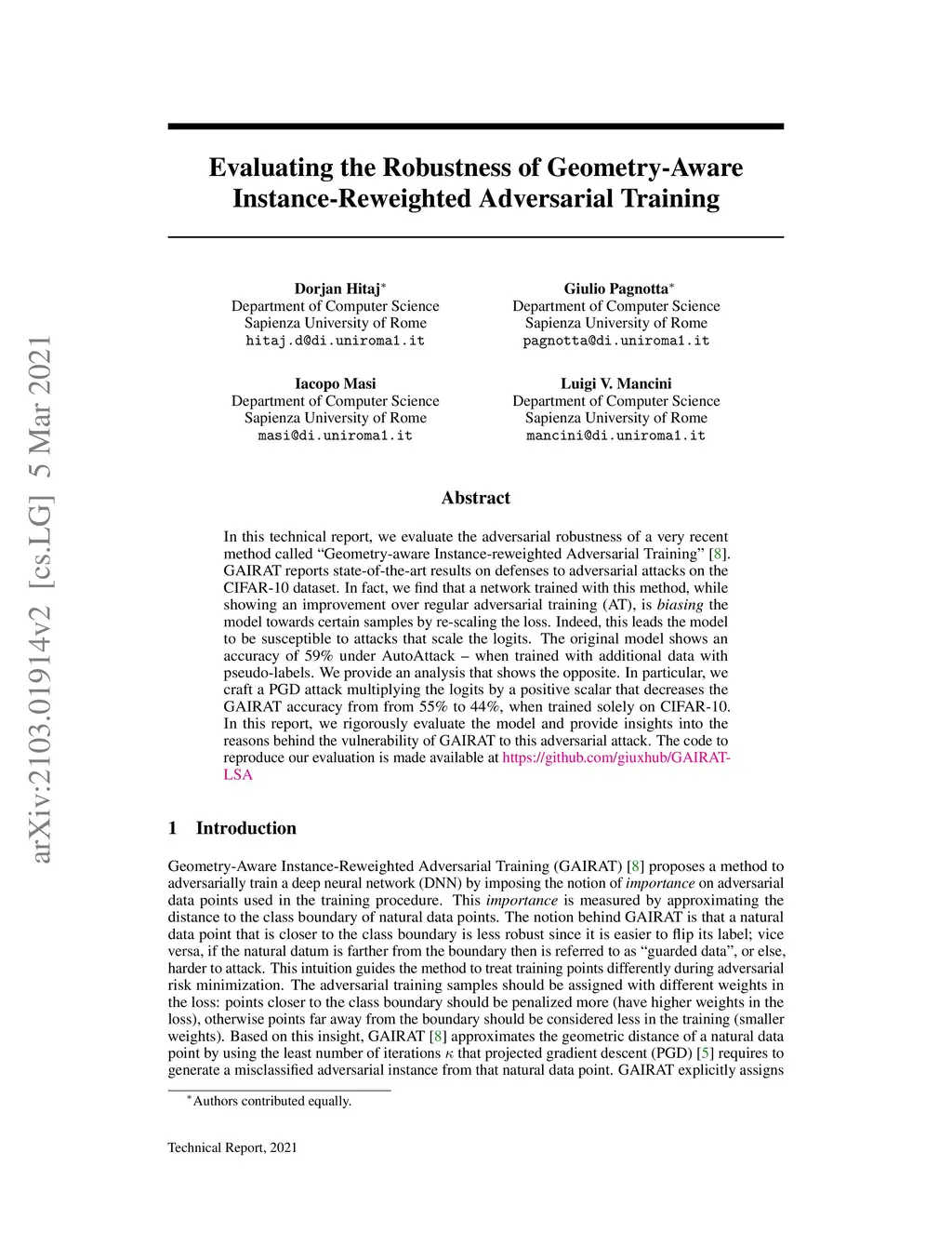 In this technical report, we evaluate the adversarial robustness of a very recent method called "Geometry-aware Instance-reweighted Adversarial Training"[7]. GAIRAT reports state-of-the-art results on defenses to adversarial attacks on the CIFAR-10 dataset. In fact, we find that a network trained with this method, while showing an improvement over regular adversarial training (AT), is biasing the model towards certain samples by re-scaling the loss. Indeed, this leads the model to be susceptible to attacks that scale the logits. The original model shows an accuracy of 59% under AutoAttack - when trained with additional data with pseudo-labels. We provide an analysis that shows the opposite. In particular, we craft a PGD attack multiplying the logits by a positive scalar that decreases the GAIRAT accuracy from from 55% to 44%, when trained solely on CIFAR-10. In this report, we rigorously evaluate the model and provide insights into the reasons behind the vulnerability of GAIRAT to this adversarial attack. The code to reproduce our evaluation is made available at https://github.com/giuxhub/GAIRAT-LSA
