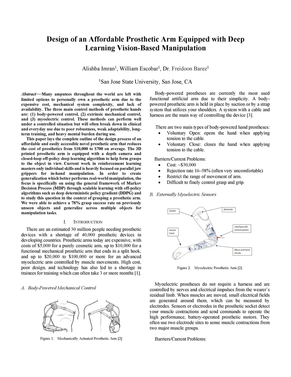 Many amputees throughout the world are left with limited options to personally own a prosthetic arm due to the expensive cost, mechanical system complexity, and lack of availability. The three main control methods of prosthetic hands are: (1) body-powered control, (2) extrinsic mechanical control, and (3) myoelectric control. These methods can perform well under a controlled situation but will often break down in clinical and everyday use due to poor robustness, weak adaptability, long-term training, and heavy mental burden during use. This paper lays the complete outline of the design process of an affordable and easily accessible novel prosthetic arm that reduces the cost of prosthetics from $10,000 to $700 on average. The 3D printed prosthetic arm is equipped with a depth camera and closed-loop off-policy deep learning algorithm to help form grasps to the object in view. Current work in reinforcement learning masters only individual skills and is heavily focused on parallel jaw grippers for in-hand manipulation. In order to create generalization, which better performs real-world manipulation, the focus is specifically on using the general framework of Markov Decision Process (MDP) through scalable learning with off-policy algorithms such as deep deterministic policy gradient (DDPG) and to study this question in the context of grasping a prosthetic arm. We were able to achieve a 78% grasp success rate on previously unseen objects and generalize across multiple objects for manipulation tasks. This work will make prosthetics cheaper, easier to use and accessible globally for amputees. Future work includes applying similar approaches to other medical assistive devices where a human is interacting with a machine to complete a task.