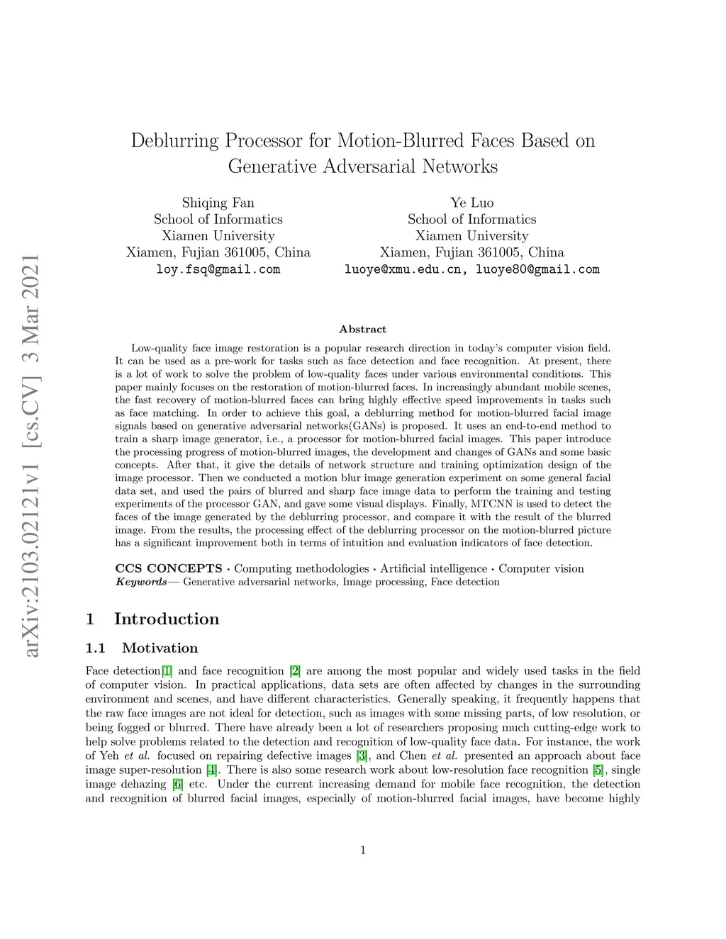 Low-quality face image restoration is a popular research direction in today's computer vision field. It can be used as a pre-work for tasks such as face detection and face recognition. At present, there is a lot of work to solve the problem of low-quality faces under various environmental conditions. This paper mainly focuses on the restoration of motion-blurred faces. In increasingly abundant mobile scenes, the fast recovery of motion-blurred faces can bring highly effective speed improvements in tasks such as face matching. In order to achieve this goal, a deblurring method for motion-blurred facial image signals based on generative adversarial networks(GANs) is proposed. It uses an end-to-end method to train a sharp image generator, i.e., a processor for motion-blurred facial images. This paper introduce the processing progress of motion-blurred images, the development and changes of GANs and some basic concepts. After that, it give the details of network structure and training optimization design of the image processor. Then we conducted a motion blur image generation experiment on some general facial data set, and used the pairs of blurred and sharp face image data to perform the training and testing experiments of the processor GAN, and gave some visual displays. Finally, MTCNN is used to detect the faces of the image generated by the deblurring processor, and compare it with the result of the blurred image. From the results, the processing effect of the deblurring processor on the motion-blurred picture has a significant improvement both in terms of intuition and evaluation indicators of face detection.