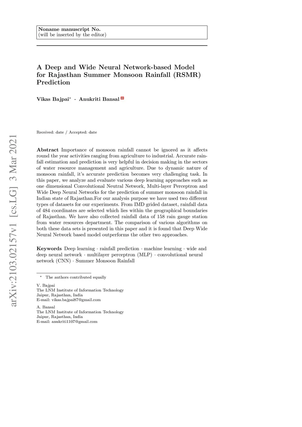 A Deep and Wide Neural Network-based Model for Rajasthan Summer Monsoon