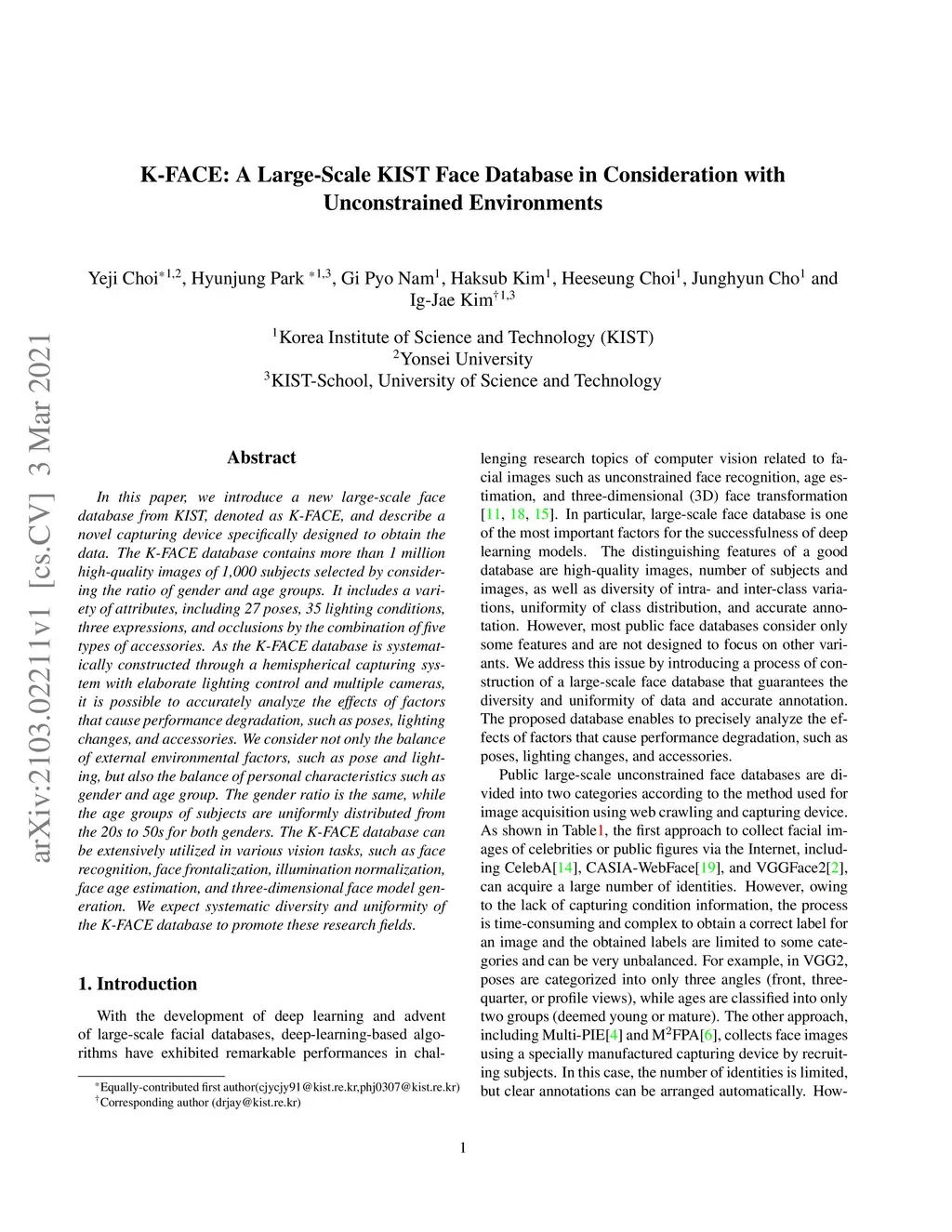 In this paper, we introduce a new large-scale face database from KIST, denoted as K-FACE, and describe a novel capturing device specifically designed to obtain the data. The K-FACE database contains more than 1 million high-quality images of 1,000 subjects selected by considering the ratio of gender and age groups. It includes a variety of attributes, including 27 poses, 35 lighting conditions, three expressions, and occlusions by the combination of five types of accessories. As the K-FACE database is systematically constructed through a hemispherical capturing system with elaborate lighting control and multiple cameras, it is possible to accurately analyze the effects of factors that cause performance degradation, such as poses, lighting changes, and accessories. We consider not only the balance of external environmental factors, such as pose and lighting, but also the balance of personal characteristics such as gender and age group. The gender ratio is the same, while the age groups of subjects are uniformly distributed from the 20s to 50s for both genders. The K-FACE database can be extensively utilized in various vision tasks, such as face recognition, face frontalization, illumination normalization, face age estimation, and three-dimensional face model generation. We expect systematic diversity and uniformity of the K-FACE database to promote these research fields.