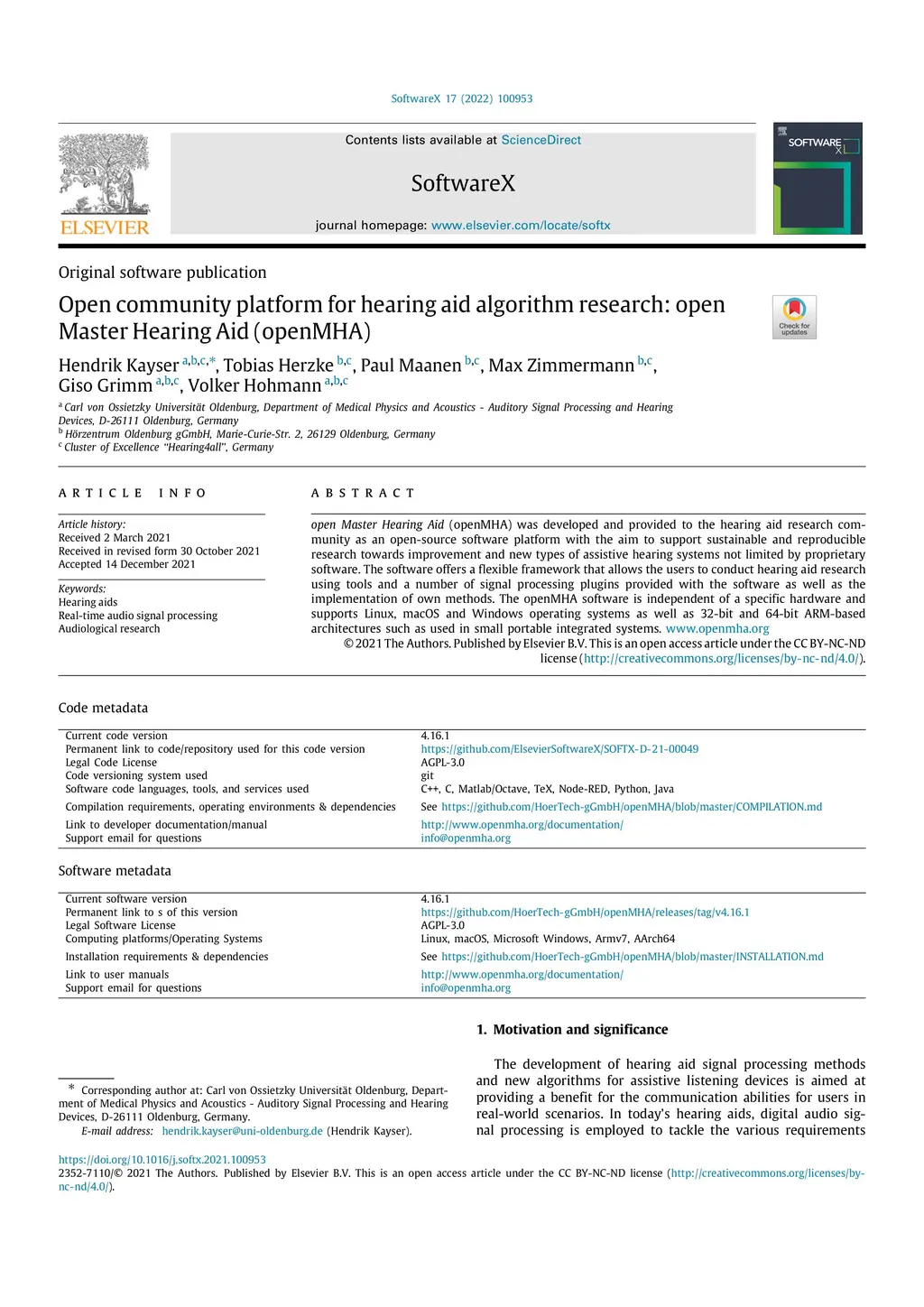 open Master Hearing Aid (openMHA) was developed and provided to the hearing aid research community as an open-source software platform with the aim to support sustainable and reproducible research towards improvement and new types of assistive hearing systems not limited by proprietary software. The software offers a flexible framework that allows the users to conduct hearing aid research using tools and a number of signal processing plugins provided with the software as well as the implementation of own methods. The openMHA software is independent of a specific hardware and supports Linux, macOS and Windows operating systems as well as 32-bit and 64-bit ARM-based architectures such as used in small portable integrated systems. www.openmha.org
