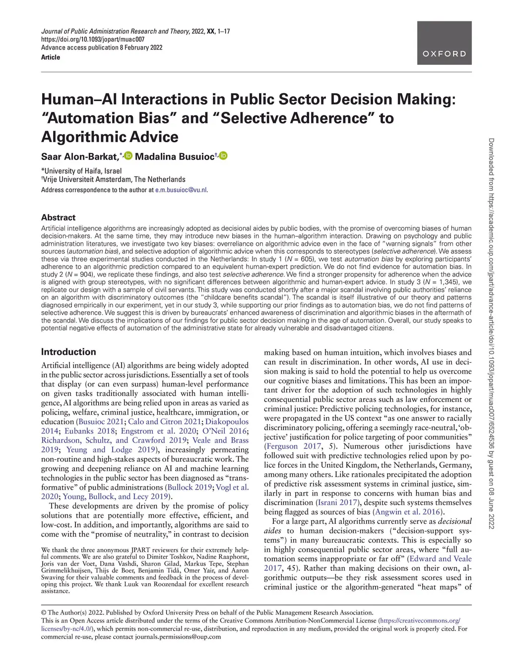 Artificial intelligence algorithms are increasingly adopted as decisional aides by public bodies, with the promise of overcoming biases of human decision-makers. At the same time, they may introduce new biases in the human-algorithm interaction. Drawing on psychology and public administration literatures, we investigate two key biases: overreliance on algorithmic advice even in the face of warning signals from other sources (automation bias), and selective adoption of algorithmic advice when this corresponds to stereotypes (selective adherence). We assess these via three experimental studies conducted in the NetherlandsWe discuss the implications of our findings for public sector decision making in the age of automation. Overall, our study speaks to potential negative effects of automation of the administrative state for already vulnerable and disadvantaged citizens.