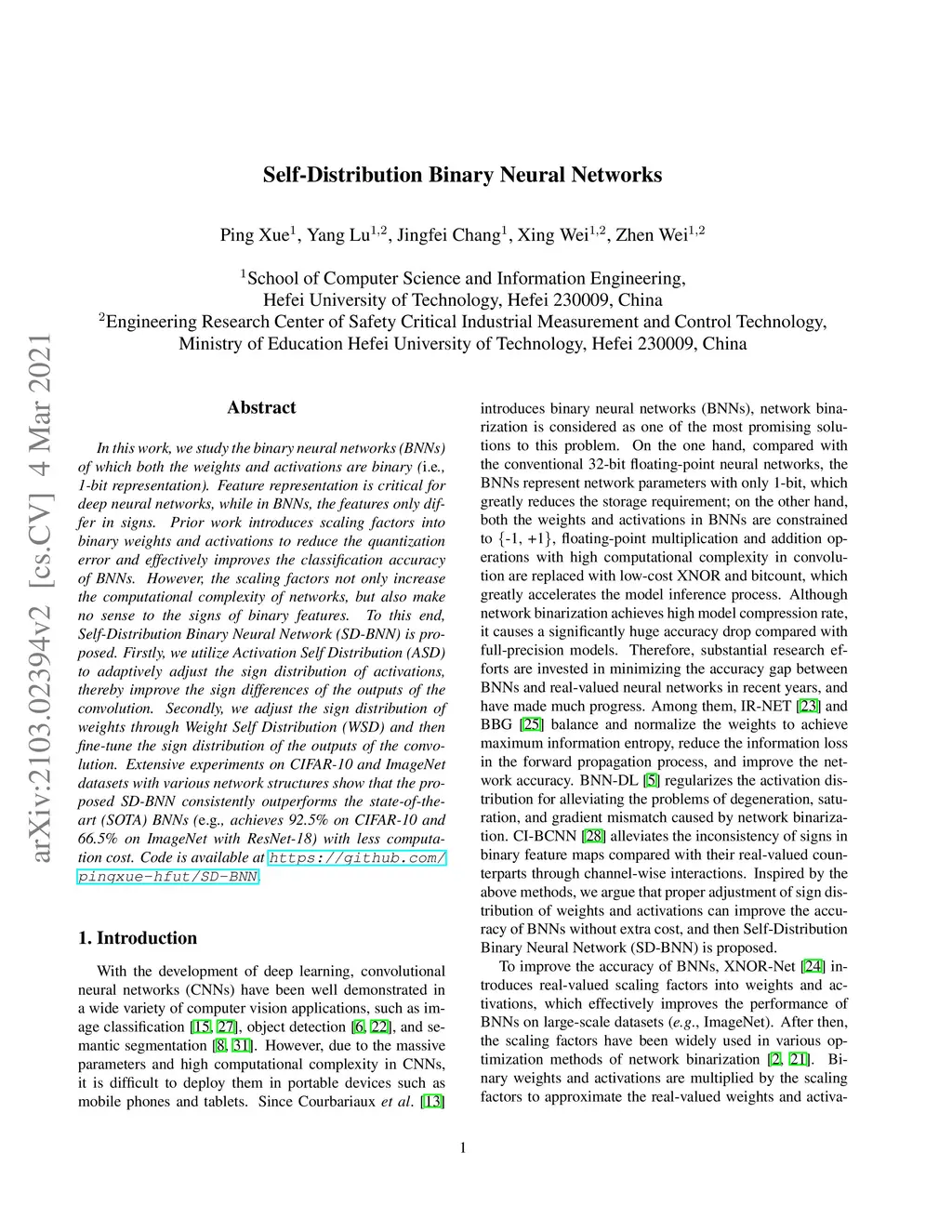 In this work, we study the binary neural networks (BNNs) of which both the weights and activations are binary (i.e., 1-bit representation). Feature representation is critical for deep neural networks, while in BNNs, the features only differ in signs. Prior work introduces scaling factors into binary weights and activations to reduce the quantization error and effectively improves the classification accuracy of BNNs. However, the scaling factors not only increase the computational complexity of networks, but also make no sense to the signs of binary features. To this end, Self-Distribution Binary Neural Network (SD-BNN) is proposed. Firstly, we utilize Activation Self Distribution (ASD) to adaptively adjust the sign distribution of activations, thereby improve the sign differences of the outputs of the convolution. Secondly, we adjust the sign distribution of weights through Weight Self Distribution (WSD) and then fine-tune the sign distribution of the outputs of the convolution. Extensive experiments on CIFAR-10 and ImageNet datasets with various network structures show that the proposed SD-BNN consistently outperforms the state-of-the-art (SOTA) BNNs (e.g., achieves 92.5% on CIFAR-10 and 66.5% on ImageNet with ResNet-18) with less computation cost. Code is available at https://github.com/ pingxue-hfut/SD-BNN.