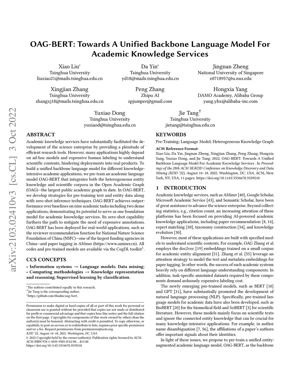 Academic knowledge services have substantially facilitated the development of the science enterprise by providing a plenitude of efficient research tools. However, many applications highly depend on ad-hoc models and expensive human labeling to understand scientific contents, hindering deployments into real products. To build a unified backbone language model for different knowledge-intensive academic applications, we pre-train an academic language model OAG-BERT that integrates both the heterogeneous entity knowledge and scientific corpora in the Open Academic Graph (OAG) -- the largest public academic graph to date. In OAG-BERT, we develop strategies for pre-training text and entity data along with zero-shot inference techniques. In OAG-BERT, we develop strategies for pre-training text and entity data along with zero-shot inference techniques. Its zero-shot capability furthers the path to mitigate the need of expensive annotations. OAG-BERT has been deployed for real-world applications, such as the reviewer recommendation function for National Nature Science Foundation of China (NSFC) -- one of the largest funding agencies in China -- and paper tagging in AMiner. All codes and pre-trained models are available via the CogDL toolkit.