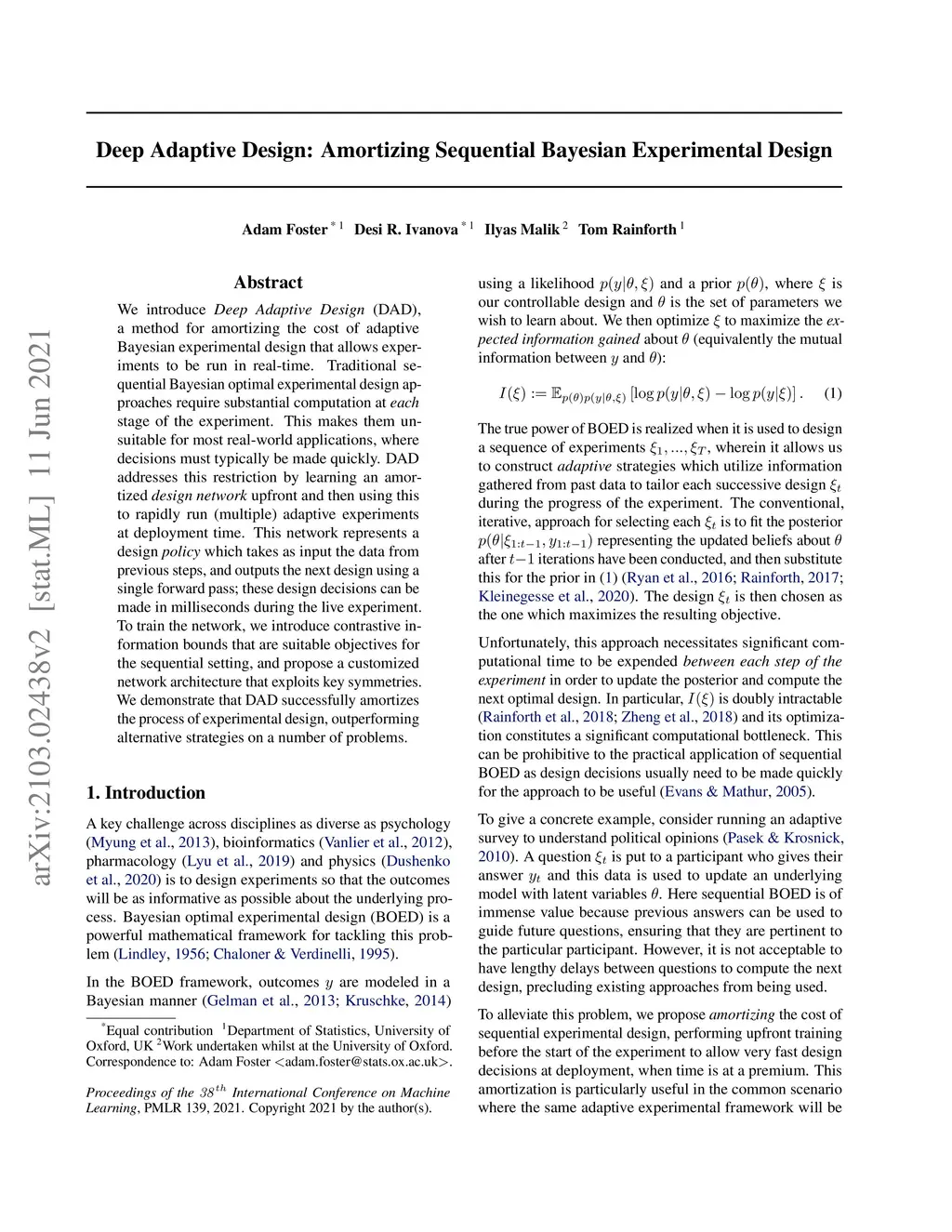 We introduce Deep Adaptive Design (DAD), a method for amortizing the cost of adaptive Bayesian experimental design that allows experiments to be run in real-time. Traditional sequential Bayesian optimal experimental design approaches require substantial computation at each stage of the experiment. This makes them unsuitable for most real-world applications, where decisions must typically be made quickly. DAD addresses this restriction by learning an amortized design network upfront and then using this to rapidly run (multiple) adaptive experiments at deployment time. This network represents a design policy which takes as input the data from previous steps, and outputs the next design using a single forward pass; these design decisions can be made in milliseconds during the live experiment. To train the network, we introduce contrastive information bounds that are suitable objectives for the sequential setting, and propose a customized network architecture that exploits key symmetries. We demonstrate that DAD successfully amortizes the process of experimental design, outperforming alternative strategies on a number of problems.