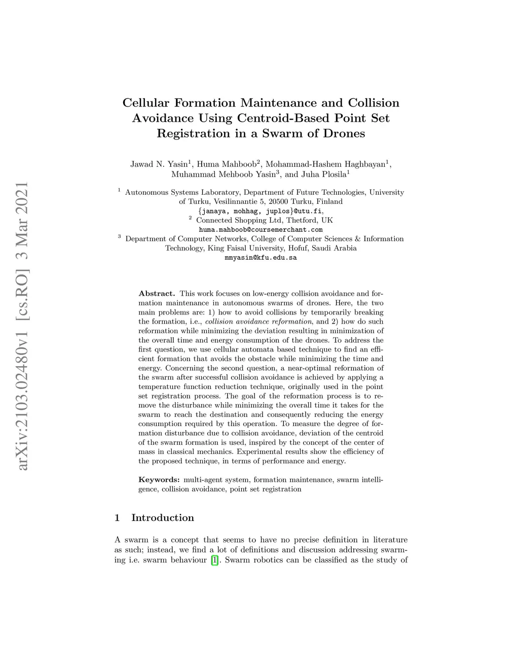 This work focuses on low-energy collision avoidance and formation maintenance in autonomous swarms of drones. Here, the two main problems are: 1) how to avoid collisions by temporarily breaking the formation, i.e., collision avoidance reformation, and 2) how do such reformation while minimizing the deviation resulting in minimization of the overall time and energy consumption of the drones. To address the first question, we use cellular automata based technique to find an efficient formation that avoids the obstacle while minimizing the time and energy. Concerning the second question, a near-optimal reformation of the swarm after successful collision avoidance is achieved by applying a temperature function reduction technique, originally used in the point set registration process. The goal of the reformation process is to remove the disturbance while minimizing the overall time it takes for the swarm to reach the destination and consequently reducing the energy consumption required by this operation. To measure the degree of formation disturbance due to collision avoidance, deviation of the centroid of the swarm formation is used, inspired by the concept of the center of mass in classical mechanics. Experimental results show the efficiency of the proposed technique, in terms of performance and energy.