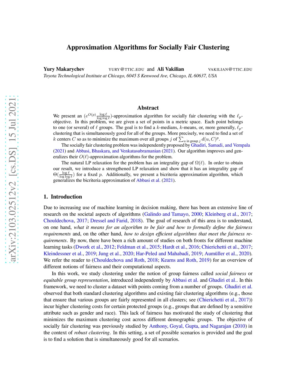 We present an -approximation algorithm for socially fair clustering with the -objective. In this problem, we are given a set of points in a metric space. Each point belongs to one (or several) of groups. The goal is to find a -medians, -means, or, more generally, -clustering that is simultaneously good for all of the groups. More precisely, we need to find a set of centers so as to minimize the maximum over all groups of . The socially fair clustering problem was independently proposed by Ghadiri, Samadi, and Vempala [2021] and Abbasi, Bhaskara, and Venkatasubramanian [2021]. Our algorithm improves and generalizes their -approximation algorithms for the problem. The natural LP relaxation for the problem has an integrality gap of . In order to obtain our result, we introduce a strengthened LP relaxation and show that it has an integrality gap of for a fixed . Additionally, we present a bicriteria approximation algorithm, which generalizes the bicriteria approximation of Abbasi et al. [2021].