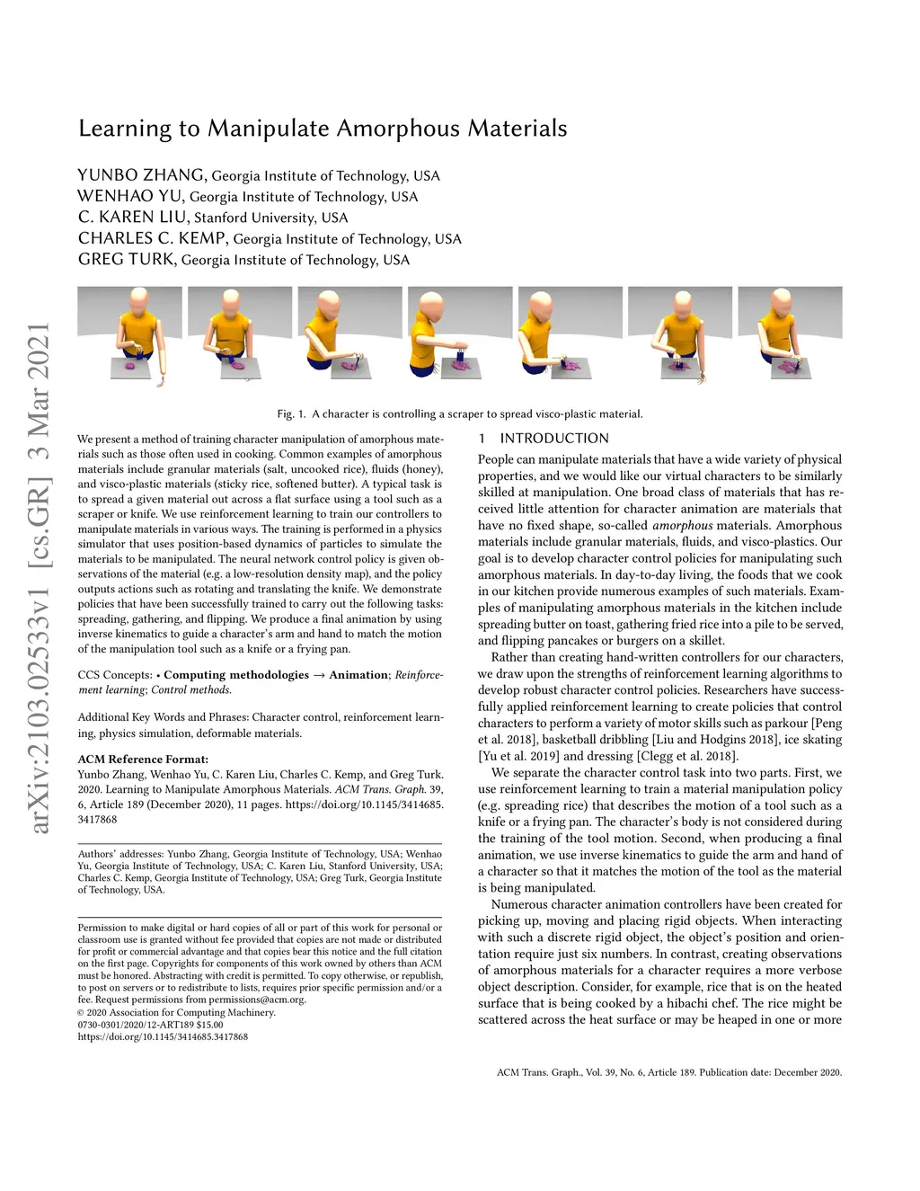 We present a method of training character manipulation of amorphous materials such as those often used in cooking. Common examples of amorphous materials include granular materials (salt, uncooked rice), fluids (honey), and visco-plastic materials (sticky rice, softened butter). A typical task is to spread a given material out across a flat surface using a tool such as a scraper or knife. We use reinforcement learning to train our controllers to manipulate materials in various ways. The training is performed in a physics simulator that uses position-based dynamics of particles to simulate the materials to be manipulated. The neural network control policy is given observations of the material (e.g. a low-resolution density map), and the policy outputs actions such as rotating and translating the knife. We demonstrate policies that have been successfully trained to carry out the following tasks: spreading, gathering, and flipping. We produce a final animation by using inverse kinematics to guide a character's arm and hand to match the motion of the manipulation tool such as a knife or a frying pan.
