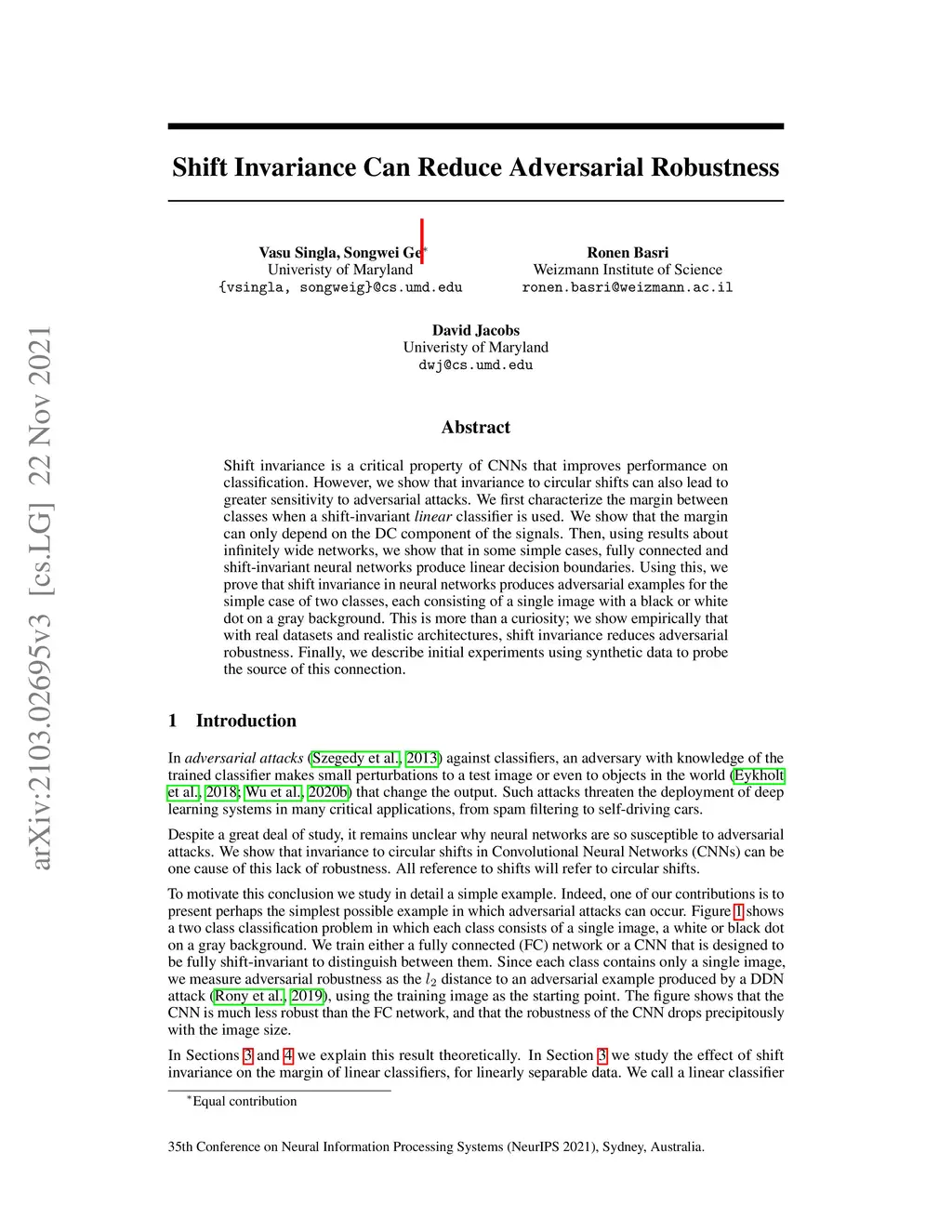 Shift invariance is a critical property of CNNs that improves performance on classification. However, we show that invariance to circular shifts can also lead to greater sensitivity to adversarial attacks. We first characterize the margin between classes when a shift-invariant linear classifier is used. We show that the margin can only depend on the DC component of the signals. Then, using results about infinitely wide networks, we show that in some simple cases, fully connected and shift-invariant neural networks produce linear decision boundaries. Using this, we prove that shift invariance in neural networks produces adversarial examples for the simple case of two classes, each consisting of a single image with a black or white dot on a gray background. This is more than a curiosity; we show empirically that with real datasets and realistic architectures, shift invariance reduces adversarial robustness. Finally, we describe initial experiments using synthetic data to probe the source of this connection.