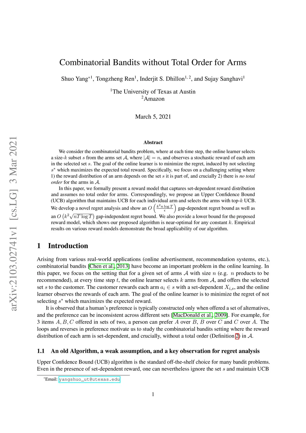 We consider the combinatorial bandits problem, where at each time step, the online learner selects a size- subset from the arms set , where , and observes a stochastic reward of each arm in the selected set . The goal of the online learner is to minimize the regret, induced by not selecting which maximizes the expected total reward. Specifically, we focus on a challenging setting where 1) the reward distribution of an arm depends on the set it is part of, and crucially 2) there is \textit{no total order} for the arms in . In this paper, we formally present a reward model that captures set-dependent reward distribution and assumes no total order for arms. Correspondingly, we propose an Upper Confidence Bound (UCB) algorithm that maintains UCB for each individual arm and selects the arms with top- UCB. We develop a novel regret analysis and show an gap-dependent regret bound as well as an gap-independent regret bound. We also provide a lower bound for the proposed reward model, which shows our proposed algorithm is near-optimal for any constant . Empirical results on various reward models demonstrate the broad applicability of our algorithm.