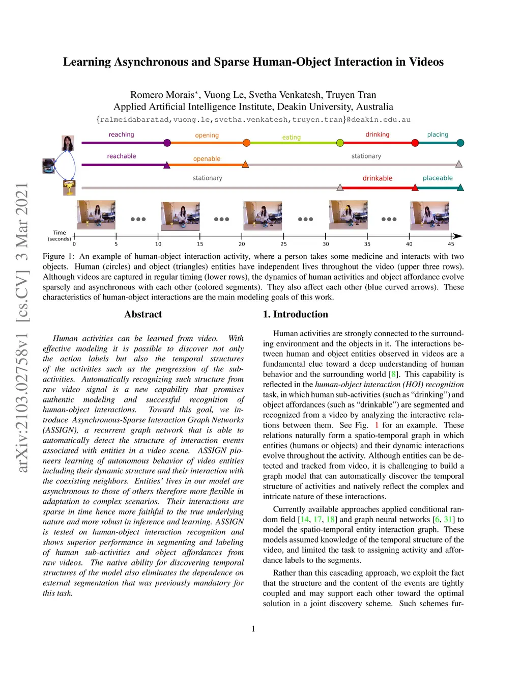 Human activities can be learned from video. With effective modeling it is possible to discover not only the action labels but also the temporal structures of the activities such as the progression of the sub-activities. Automatically recognizing such structure from raw video signal is a new capability that promises authentic modeling and successful recognition of human-object interactions. Toward this goal, we introduce Asynchronous-Sparse Interaction Graph Networks (ASSIGN), a recurrent graph network that is able to automatically detect the structure of interaction events associated with entities in a video scene. ASSIGN pioneers learning of autonomous behavior of video entities including their dynamic structure and their interaction with the coexisting neighbors. Entities' lives in our model are asynchronous to those of others therefore more flexible in adaptation to complex scenarios. Their interactions are sparse in time hence more faithful to the true underlying nature and more robust in inference and learning. ASSIGN is tested on human-object interaction recognition and shows superior performance in segmenting and labeling of human sub-activities and object affordances from raw videos. The native ability for discovering temporal structures of the model also eliminates the dependence on external segmentation that was previously mandatory for this task.