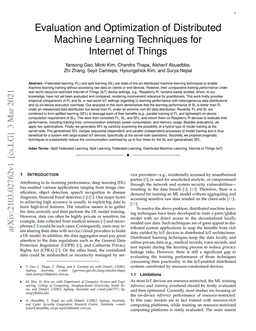 Federated learning (FL) and split learning (SL) are state-of-the-art distributed machine learning techniques to enable machine learning training without accessing raw data on clients or end devices. However, their \emph{comparative training performance} under real-world resource-restricted Internet of Things (IoT) device settings, e.g., Raspberry Pi, remains barely studied, which, to our knowledge, have not yet been evaluated and compared, rendering inconvenient reference for practitioners. This work firstly provides empirical comparisons of FL and SL in real-world IoT settings regarding (i) learning performance with heterogeneous data distributions and (ii) on-device execution overhead. Our analyses in this work demonstrate that the learning performance of SL is better than FL under an imbalanced data distribution but worse than FL under an extreme non-IID data distribution. Recently, FL and SL are combined to form splitfed learning (SFL) to leverage each of their benefits (e.g., parallel training of FL and lightweight on-device computation requirement of SL). This work then considers FL, SL, and SFL, and mount them on Raspberry Pi devices to evaluate their performance, including training time, communication overhead, power consumption, and memory usage. Besides evaluations, we apply two optimizations. Firstly, we generalize SFL by carefully examining the possibility of a hybrid type of model training at the server-side. The generalized SFL merges sequential (dependent) and parallel (independent) processes of model training and is thus beneficial for a system with large-scaled IoT devices, specifically at the server-side operations. Secondly, we propose pragmatic techniques to substantially reduce the communication overhead by up to four times for the SL and (generalized) SFL.