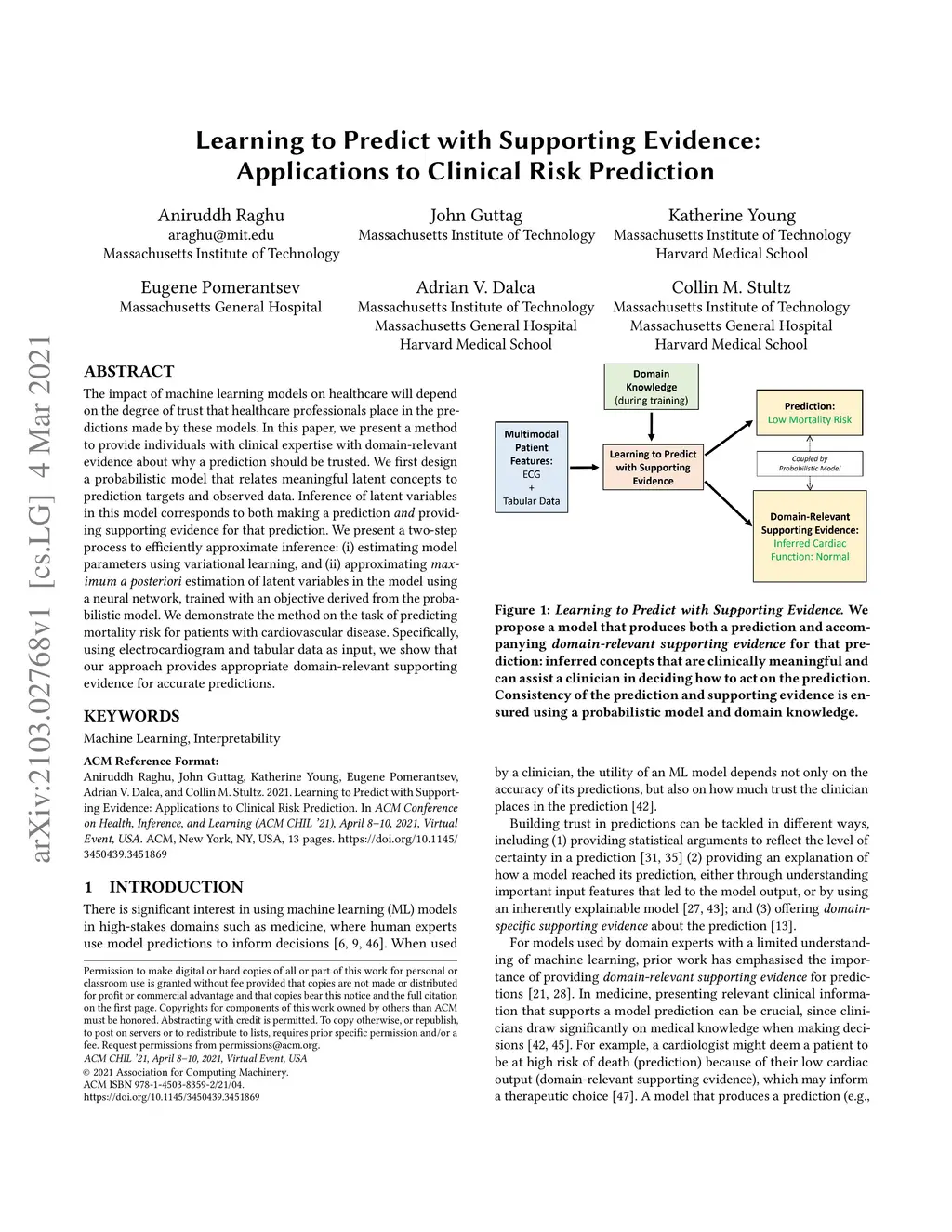 The impact of machine learning models on healthcare will depend on the degree of trust that healthcare professionals place in the predictions made by these models. In this paper, we present a method to provide people with clinical expertise with domain-relevant evidence about why a prediction should be trusted. We first design a probabilistic model that relates meaningful latent concepts to prediction targets and observed data. Inference of latent variables in this model corresponds to both making a prediction and providing supporting evidence for that prediction. We present a two-step process to efficiently approximate inference: (i) estimating model parameters using variational learning, and (ii) approximating maximum a posteriori estimation of latent variables in the model using a neural network, trained with an objective derived from the probabilistic model. We demonstrate the method on the task of predicting mortality risk for patients with cardiovascular disease. Specifically, using electrocardiogram and tabular data as input, we show that our approach provides appropriate domain-relevant supporting evidence for accurate predictions.