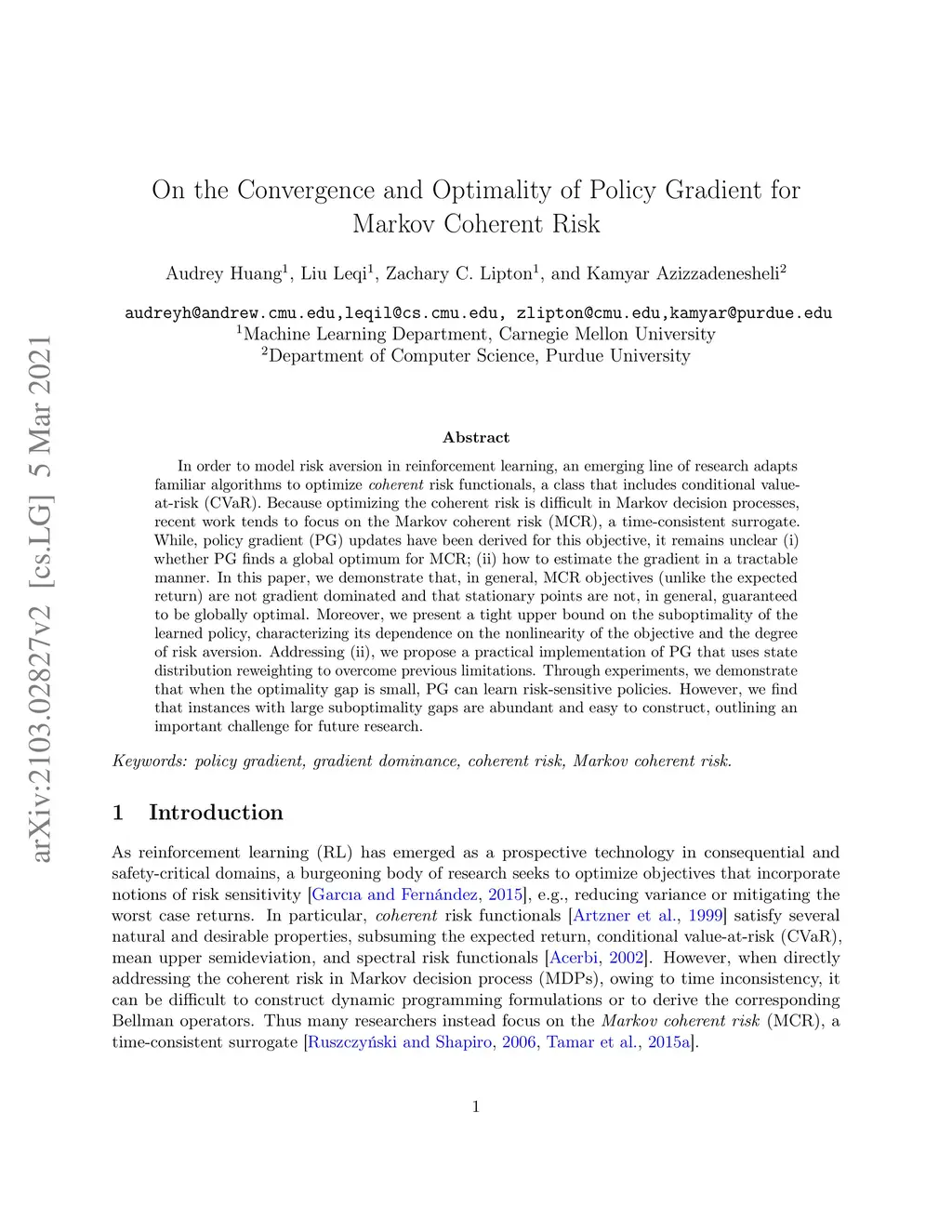 In order to model risk aversion in reinforcement learning, an emerging line of research adapts familiar algorithms to optimize coherent risk functionals, a class that includes conditional value-at-risk (CVaR). Because optimizing the coherent risk is difficult in Markov decision processes, recent work tends to focus on the Markov coherent risk (MCR), a time-consistent surrogate. While, policy gradient (PG) updates have been derived for this objective, it remains unclear (i) whether PG finds a global optimum for MCR; (ii) how to estimate the gradient in a tractable manner. In this paper, we demonstrate that, in general, MCR objectives (unlike the expected return) are not gradient dominated and that stationary points are not, in general, guaranteed to be globally optimal. Moreover, we present a tight upper bound on the suboptimality of the learned policy, characterizing its dependence on the nonlinearity of the objective and the degree of risk aversion. Addressing (ii), we propose a practical implementation of PG that uses state distribution reweighting to overcome previous limitations. Through experiments, we demonstrate that when the optimality gap is small, PG can learn risk-sensitive policies. However, we find that instances with large suboptimality gaps are abundant and easy to construct, outlining an important challenge for future research.
