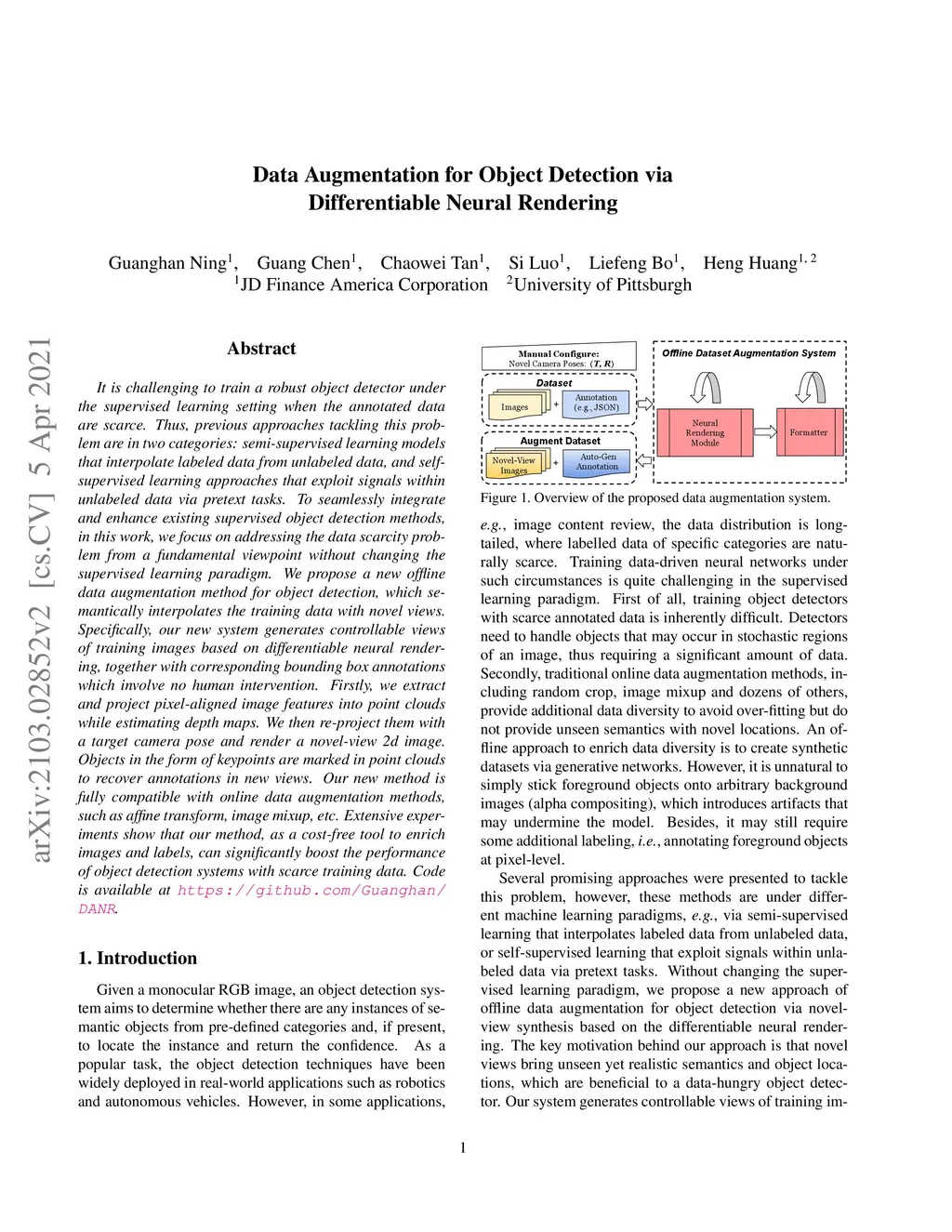 It is challenging to train a robust object detector under the supervised learning setting when the annotated data are scarce. Thus, previous approaches tackling this problem are in two categories: semi-supervised learning models that interpolate labeled data from unlabeled data, and self-supervised learning approaches that exploit signals within unlabeled data via pretext tasks. To seamlessly integrate and enhance existing supervised object detection methods, in this work, we focus on addressing the data scarcity problem from a fundamental viewpoint without changing the supervised learning paradigm. We propose a new offline data augmentation method for object detection, which semantically interpolates the training data with novel views. Specifically, our new system generates controllable views of training images based on differentiable neural rendering, together with corresponding bounding box annotations which involve no human intervention. Firstly, we extract and project pixel-aligned image features into point clouds while estimating depth maps. We then re-project them with a target camera pose and render a novel-view 2d image. Objects in the form of keypoints are marked in point clouds to recover annotations in new views. Our new method is fully compatible with online data augmentation methods, such as affine transform, image mixup, etc. Extensive experiments show that our method, as a cost-free tool to enrich images and labels, can significantly boost the performance of object detection systems with scarce training data. Code is available at \url{https://github.com/Guanghan/DANR}.