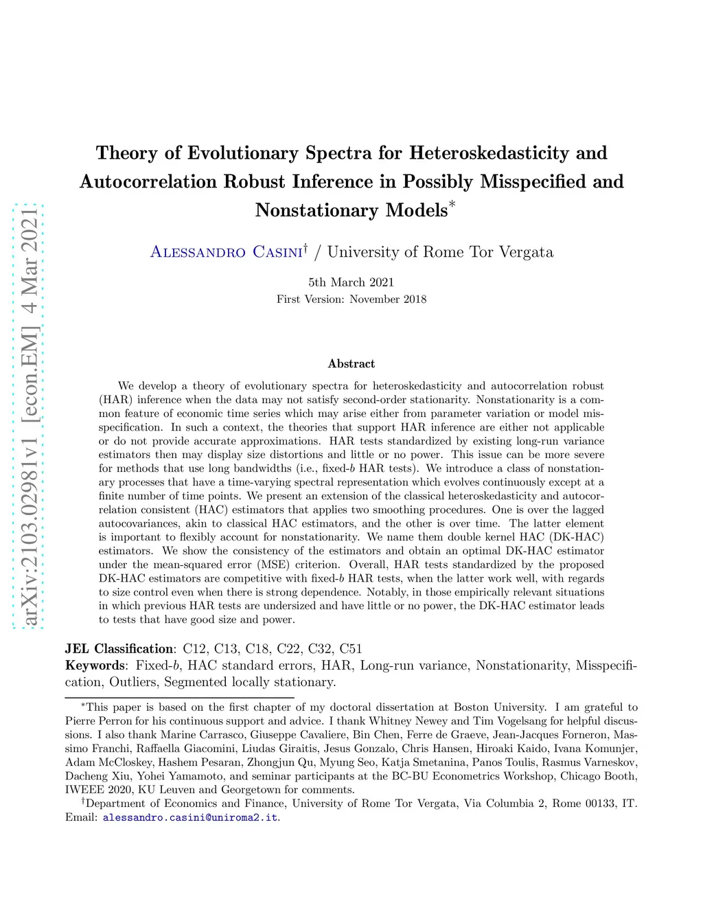 We develop a theory of evolutionary spectra for heteroskedasticity and autocorrelation robust (HAR) inference when the data may not satisfy second-order stationarity. Nonstationarity is a common feature of economic time series which may arise either from parameter variation or model misspecification. In such a context, the theories that support HAR inference are either not applicable or do not provide accurate approximations. HAR tests standardized by existing long-run variance estimators then may display size distortions and little or no power. This issue can be more severe for methods that use long bandwidths (i.e., fixed-b HAR tests). We introduce a class of nonstationary processes that have a time-varying spectral representation which evolves continuously except at a finite number of time points. We present an extension of the classical heteroskedasticity and autocorrelation consistent (HAC) estimators that applies two smoothing procedures. One is over the lagged autocovariances, akin to classical HAC estimators, and the other is over time. The latter element is important to flexibly account for nonstationarity. We name them double kernel HAC (DK-HAC) estimators. We show the consistency of the estimators and obtain an optimal DK-HAC estimator under the mean squared error (MSE) criterion. Overall, HAR tests standardized by the proposed DK-HAC estimators are competitive with fixed-b HAR tests, when the latter work well, with regards to size control even when there is strong dependence. Notably, in those empirically relevant situations in which previous HAR tests are undersized and have little or no power, the DK-HAC estimator leads to tests that have good size and power.