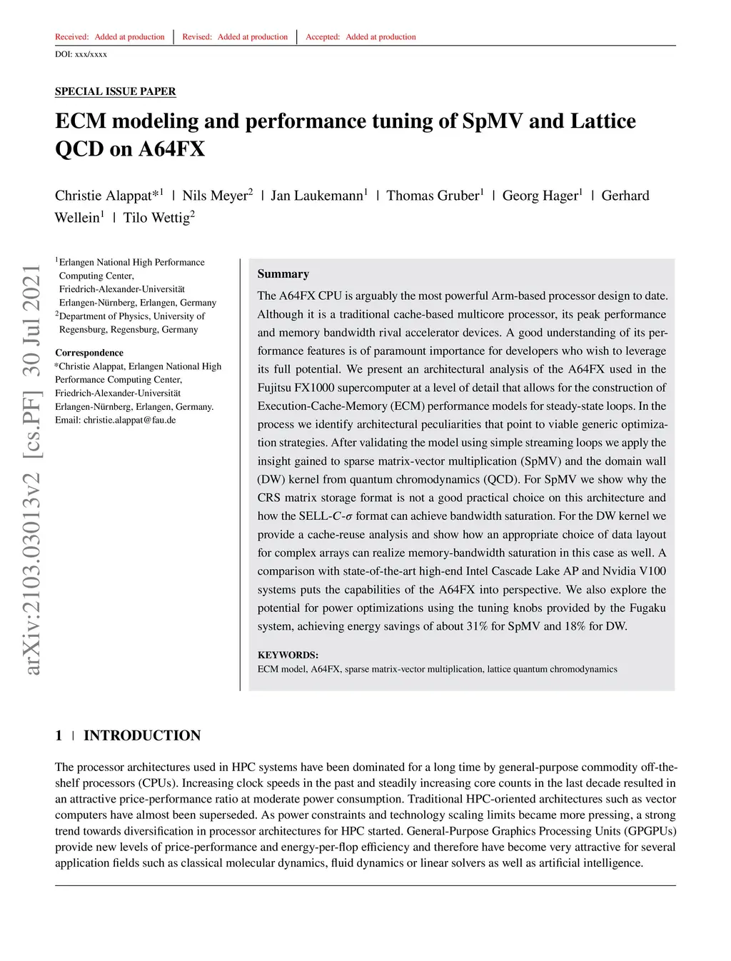 The A64FX CPU is arguably the most powerful Arm-based processor design to date. Although it is a traditional cache-based multicore processor, its peak performance and memory bandwidth rival accelerator devices. A good understanding of its performance features is of paramount importance for developers who wish to leverage its full potential. We present an architectural analysis of the A64FX used in the Fujitsu FX1000 supercomputer at a level of detail that allows for the construction of Execution-Cache-Memory (ECM) performance models for steady-state loops. In the process we identify architectural peculiarities that point to viable generic optimization strategies. After validating the model using simple streaming loops we apply the insight gained to sparse matrix-vector multiplication (SpMV) and the domain wall (DW) kernel from quantum chromodynamics (QCD). For SpMV we show why the CRS matrix storage format is not a good practical choice on this architecture and how the SELL-- format can achieve bandwidth saturation. For the DW kernel we provide a cache-reuse analysis and show how an appropriate choice of data layout for complex arrays can realize memory-bandwidth saturation in this case as well. A comparison with state-of-the-art high-end Intel Cascade Lake AP and Nvidia V100 systems puts the capabilities of the A64FX into perspective. We also explore the potential for power optimizations using the tuning knobs provided by the Fugaku system, achieving energy savings of about 31% for SpMV and 18% for DW.