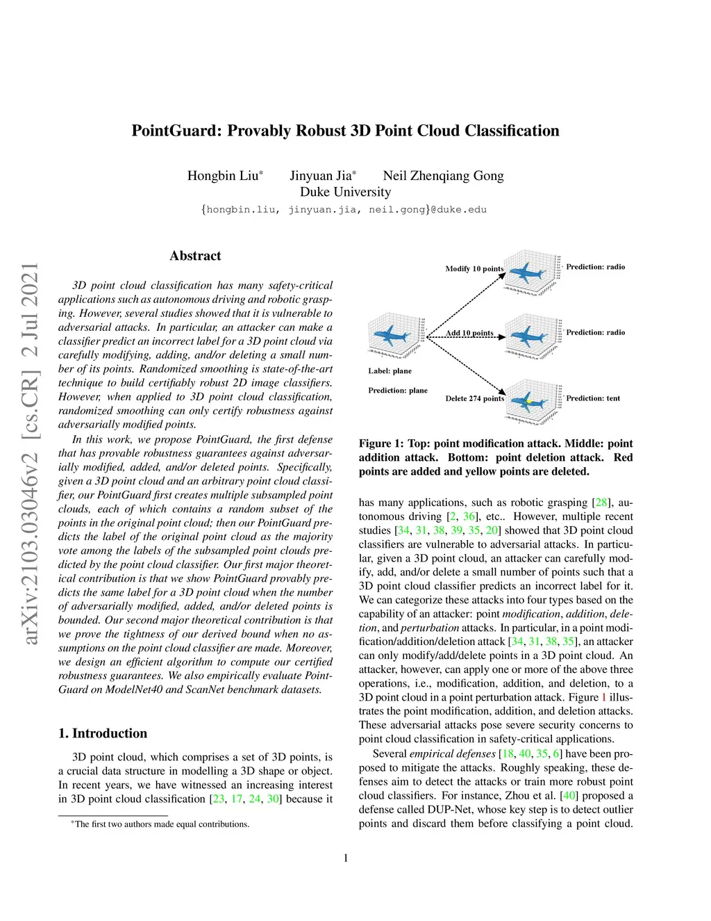 3D point cloud classification has many safety-critical applications such as autonomous driving and robotic grasping. However, several studies showed that it is vulnerable to adversarial attacks. In particular, an attacker can make a classifier predict an incorrect label for a 3D point cloud via carefully modifying, adding, and/or deleting a small number of its points. Randomized smoothing is state-of-the-art technique to build certifiably robust 2D image classifiers. However, when applied to 3D point cloud classification, randomized smoothing can only certify robustness against adversarially modified points. In this work, we propose PointGuard, the first defense that has provable robustness guarantees against adversarially modified, added, and/or deleted points. Specifically, given a 3D point cloud and an arbitrary point cloud classifier, our PointGuard first creates multiple subsampled point clouds, each of which contains a random subset of the points in the original point cloud; then our PointGuard predicts the label of the original point cloud as the majority vote among the labels of the subsampled point clouds predicted by the point cloud classifier. Our first major theoretical contribution is that we show PointGuard provably predicts the same label for a 3D point cloud when the number of adversarially modified, added, and/or deleted points is bounded. Our second major theoretical contribution is that we prove the tightness of our derived bound when no assumptions on the point cloud classifier are made. Moreover, we design an efficient algorithm to compute our certified robustness guarantees. We also empirically evaluate PointGuard on ModelNet40 and ScanNet benchmark datasets.