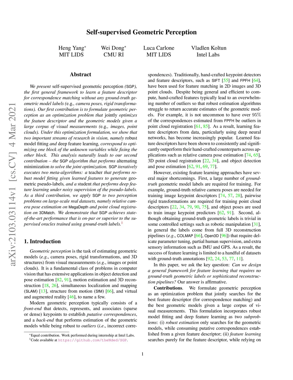 We present self-supervised geometric perception (SGP), the first general framework to learn a feature descriptor for correspondence matching without any ground-truth geometric model labels (e.g., camera poses, rigid transformations). Our first contribution is to formulate geometric perception as an optimization problem that jointly optimizes the feature descriptor and the geometric models given a large corpus of visual measurements (e.g., images, point clouds). Under this optimization formulation, we show that two important streams of research in vision, namely robust model fitting and deep feature learning, correspond to optimizing one block of the unknown variables while fixing the other block. This analysis naturally leads to our second contribution -- the SGP algorithm that performs alternating minimization to solve the joint optimization. SGP iteratively executes two meta-algorithms: a teacher that performs robust model fitting given learned features to generate geometric pseudo-labels, and a student that performs deep feature learning under noisy supervision of the pseudo-labels. As a third contribution, we apply SGP to two perception problems on large-scale real datasets, namely relative camera pose estimation on MegaDepth and point cloud registration on 3DMatch. We demonstrate that SGP achieves state-of-the-art performance that is on-par or superior to the supervised oracles trained using ground-truth labels.