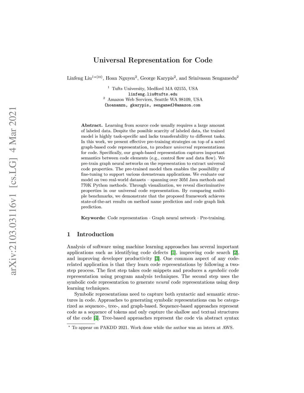 Learning from source code usually requires a large amount of labeled data. Despite the possible scarcity of labeled data, the trained model is highly task-specific and lacks transferability to different tasks. In this work, we present effective pre-training strategies on top of a novel graph-based code representation, to produce universal representations for code. Specifically, our graph-based representation captures important semantics between code elements (e.g., control flow and data flow). We pre-train graph neural networks on the representation to extract universal code properties. The pre-trained model then enables the possibility of fine-tuning to support various downstream applications. We evaluate our model on two real-world datasets -- spanning over 30M Java methods and 770K Python methods. Through visualization, we reveal discriminative properties in our universal code representation. By comparing multiple benchmarks, we demonstrate that the proposed framework achieves state-of-the-art results on method name prediction and code graph link prediction.