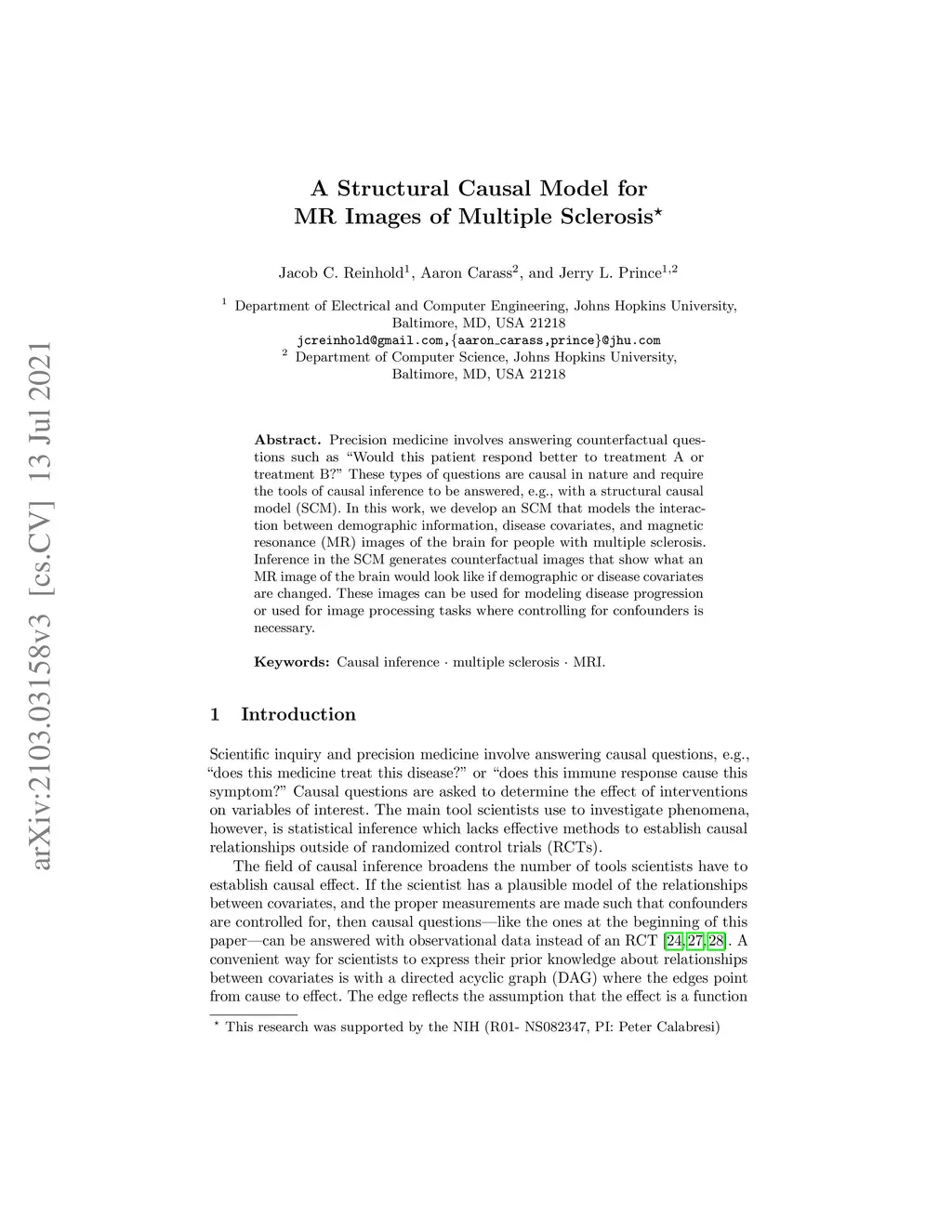 Precision medicine involves answering counterfactual questions such as "Would this patient respond better to treatment A or treatment B?" These types of questions are causal in nature and require the tools of causal inference to be answered, e.g., with a structural causal model (SCM). In this work, we develop an SCM that models the interaction between demographic information, disease covariates, and magnetic resonance (MR) images of the brain for people with multiple sclerosis. Inference in the SCM generates counterfactual images that show what an MR image of the brain would look like if demographic or disease covariates are changed. These images can be used for modeling disease progression or used for image processing tasks where controlling for confounders is necessary.