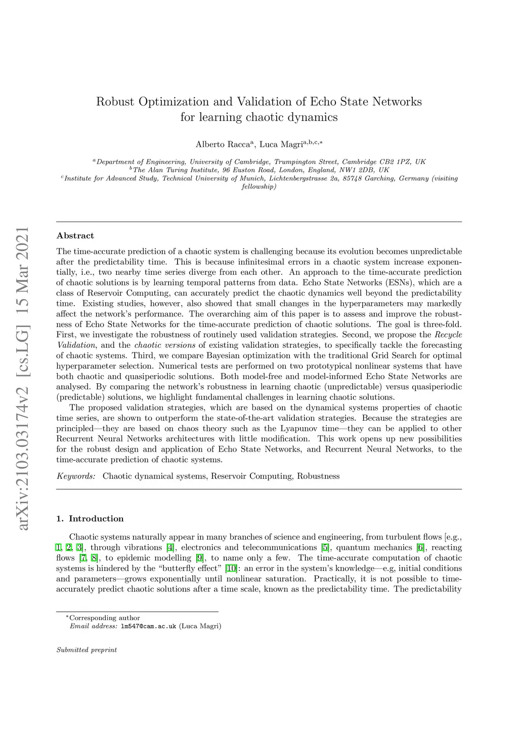 Robust Optimization and Validation of Echo State Networks for learning