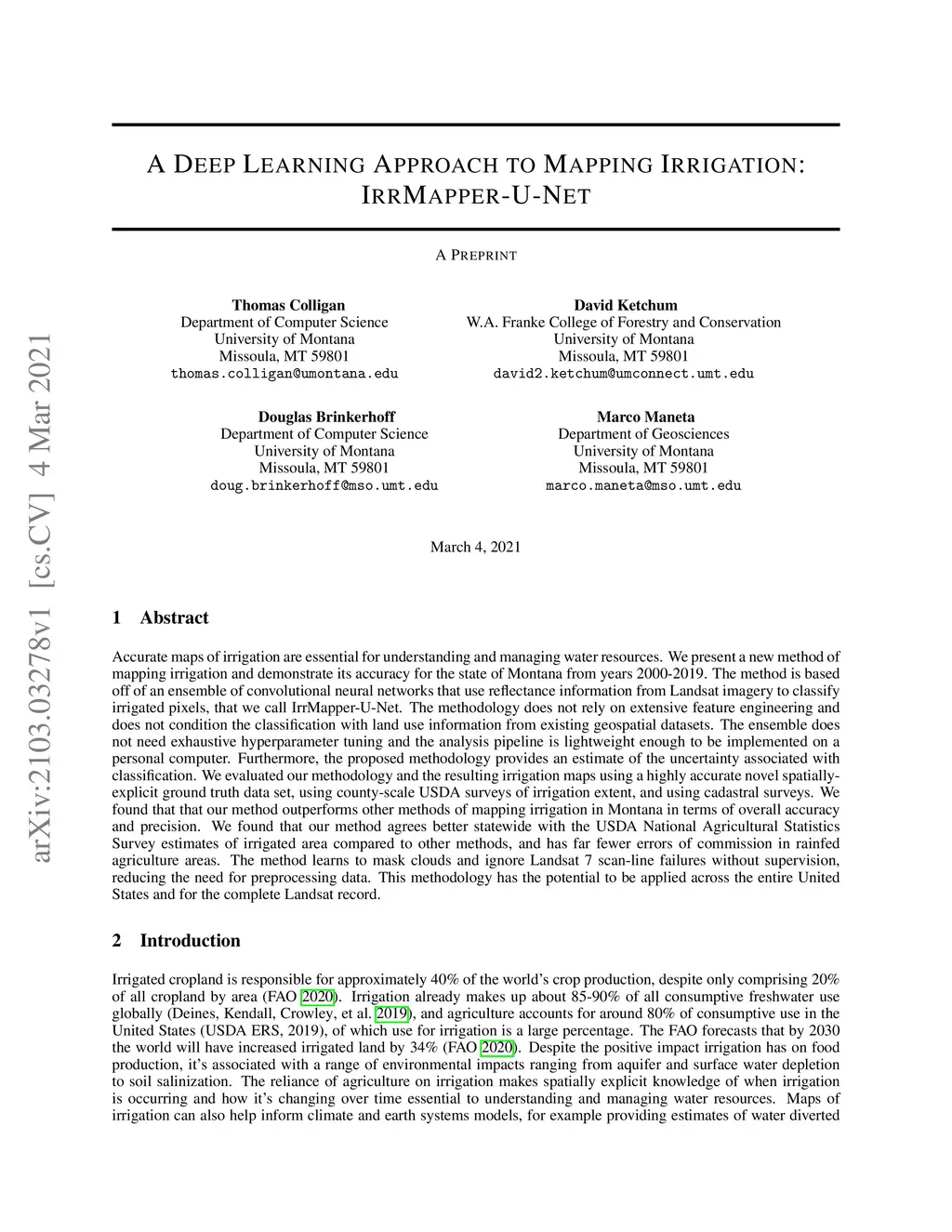 Accurate maps of irrigation are essential for understanding and managing water resources. We present a new method of mapping irrigation and demonstrate its accuracy for the state of Montana from years 2000-2019. The method is based off of an ensemble of convolutional neural networks that use reflectance information from Landsat imagery to classify irrigated pixels, that we call IrrMapper-U-Net. The methodology does not rely on extensive feature engineering and does not condition the classification with land use information from existing geospatial datasets. The ensemble does not need exhaustive hyperparameter tuning and the analysis pipeline is lightweight enough to be implemented on a personal computer. Furthermore, the proposed methodology provides an estimate of the uncertainty associated with classification. We evaluated our methodology and the resulting irrigation maps using a highly accurate novel spatially-explicit ground truth data set, using county-scale USDA surveys of irrigation extent, and using cadastral surveys. We found that that our method outperforms other methods of mapping irrigation in Montana in terms of overall accuracy and precision. We found that our method agrees better statewide with the USDA National Agricultural Statistics Survey estimates of irrigated area compared to other methods, and has far fewer errors of commission in rainfed agriculture areas. The method learns to mask clouds and ignore Landsat 7 scan-line failures without supervision, reducing the need for preprocessing data. This methodology has the potential to be applied across the entire United States and for the complete Landsat record.