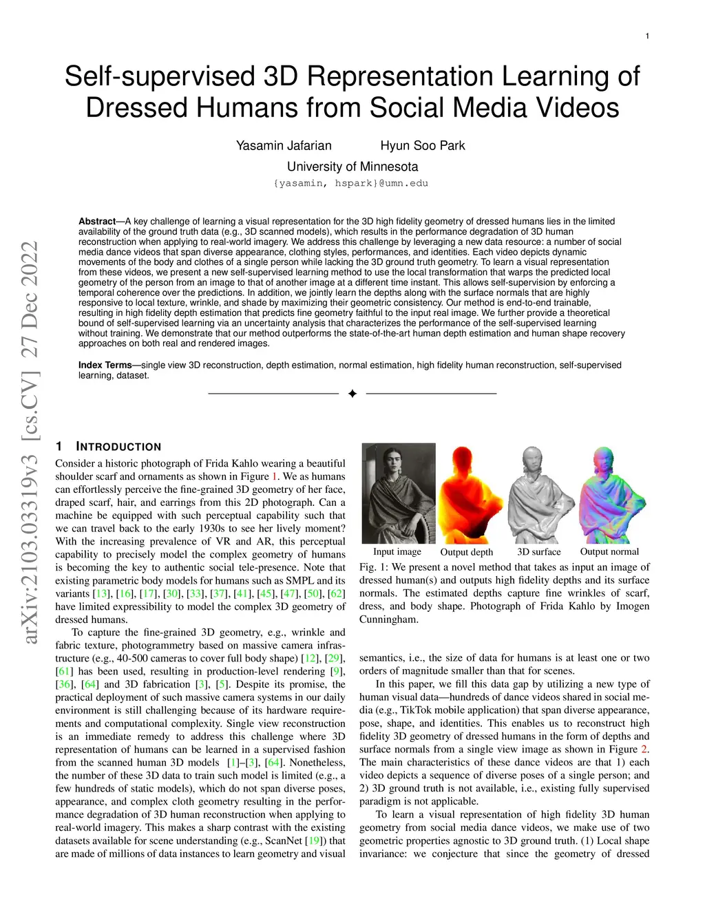 A key challenge of learning a visual representation for the 3D high fidelity geometry of dressed humans lies in the limited availability of the ground truth data (e.g., 3D scanned models), which results in the performance degradation of 3D human reconstruction when applying to real-world imagery. We address this challenge by leveraging a new data resource: a number of social media dance videos that span diverse appearance, clothing styles, performances, and identities. Each video depicts dynamic movements of the body and clothes of a single person while lacking the 3D ground truth geometry. To learn a visual representation from these videos, we present a new self-supervised learning method to use the local transformation that warps the predicted local geometry of the person from an image to that of another image at a different time instant. This allows self-supervision by enforcing a temporal coherence over the predictions. In addition, we jointly learn the depths along with the surface normals that are highly responsive to local texture, wrinkle, and shade by maximizing their geometric consistency. Our method is end-to-end trainable, resulting in high fidelity depth estimation that predicts fine geometry faithful to the input real image. We further provide a theoretical bound of self-supervised learning via an uncertainty analysis that characterizes the performance of the self-supervised learning without training. We demonstrate that our method outperforms the state-of-the-art human depth estimation and human shape recovery approaches on both real and rendered images.