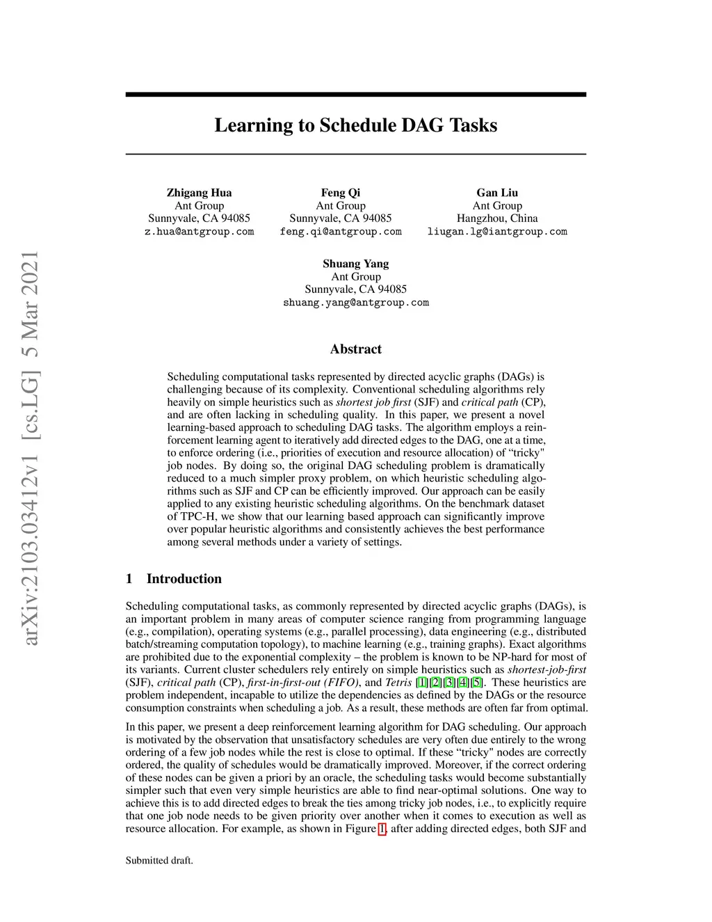 Scheduling computational tasks represented by directed acyclic graphs (DAGs) is challenging because of its complexity. Conventional scheduling algorithms rely heavily on simple heuristics such as shortest job first (SJF) and critical path (CP), and are often lacking in scheduling quality. In this paper, we present a novel learning-based approach to scheduling DAG tasks. The algorithm employs a reinforcement learning agent to iteratively add directed edges to the DAG, one at a time, to enforce ordering (i.e., priorities of execution and resource allocation) of "tricky" job nodes. By doing so, the original DAG scheduling problem is dramatically reduced to a much simpler proxy problem, on which heuristic scheduling algorithms such as SJF and CP can be efficiently improved. Our approach can be easily applied to any existing heuristic scheduling algorithms. On the benchmark dataset of TPC-H, we show that our learning based approach can significantly improve over popular heuristic algorithms and consistently achieves the best performance among several methods under a variety of settings.
