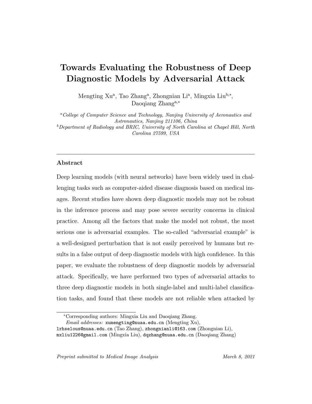 Deep learning models (with neural networks) have been widely used in challenging tasks such as computer-aided disease diagnosis based on medical images. Recent studies have shown deep diagnostic models may not be robust in the inference process and may pose severe security concerns in clinical practice. Among all the factors that make the model not robust, the most serious one is adversarial examples. The so-called "adversarial example" is a well-designed perturbation that is not easily perceived by humans but results in a false output of deep diagnostic models with high confidence. In this paper, we evaluate the robustness of deep diagnostic models by adversarial attack. Specifically, we have performed two types of adversarial attacks to three deep diagnostic models in both single-label and multi-label classification tasks, and found that these models are not reliable when attacked by adversarial example. We have further explored how adversarial examples attack the models, by analyzing their quantitative classification results, intermediate features, discriminability of features and correlation of estimated labels for both original/clean images and those adversarial ones. We have also designed two new defense methods to handle adversarial examples in deep diagnostic models, i.e., Multi-Perturbations Adversarial Training (MPAdvT) and Misclassification-Aware Adversarial Training (MAAdvT). The experimental results have shown that the use of defense methods can significantly improve the robustness of deep diagnostic models against adversarial attacks.